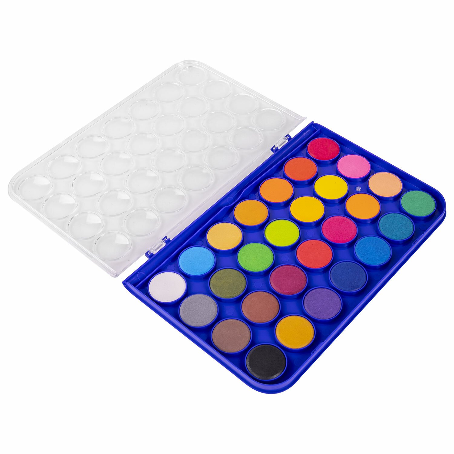 В наборе 28 насыщенных цветов, которые отлично смешиваются, позволяя создавать множество оттенков. Краски легко наносятся, образуя интенсивное яркое покрытие даже при нанесении в один слой. Обеспечивают однородное окрашивание, быстро высыхают и не портятся со временем. Краски безопасны для детей, нетоксичны. Выпускаются в пластиковом пенале с европодвесом, прозрачной крышкой, круглой формой кювет и отделением для кисточки. Съемную пластиковую крышку можно использовать в качестве палитры для смешивания красок.