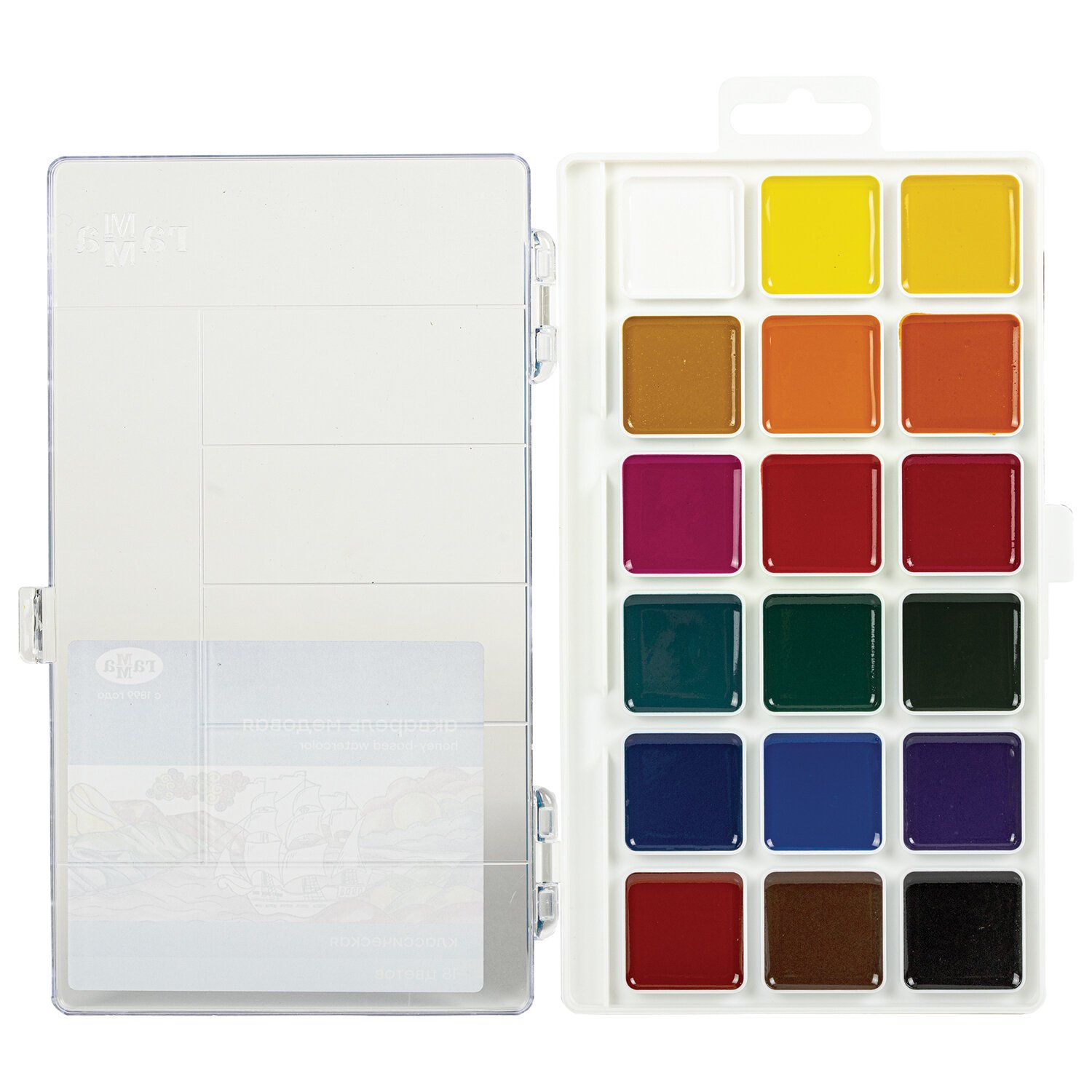 Медовая акварель в обновленной подложке: больший объем краски в кюветах – больше возможностей для творчества. Благодаря качественному прозрачному связующему в составе, цвета акварели яркие и чистые.