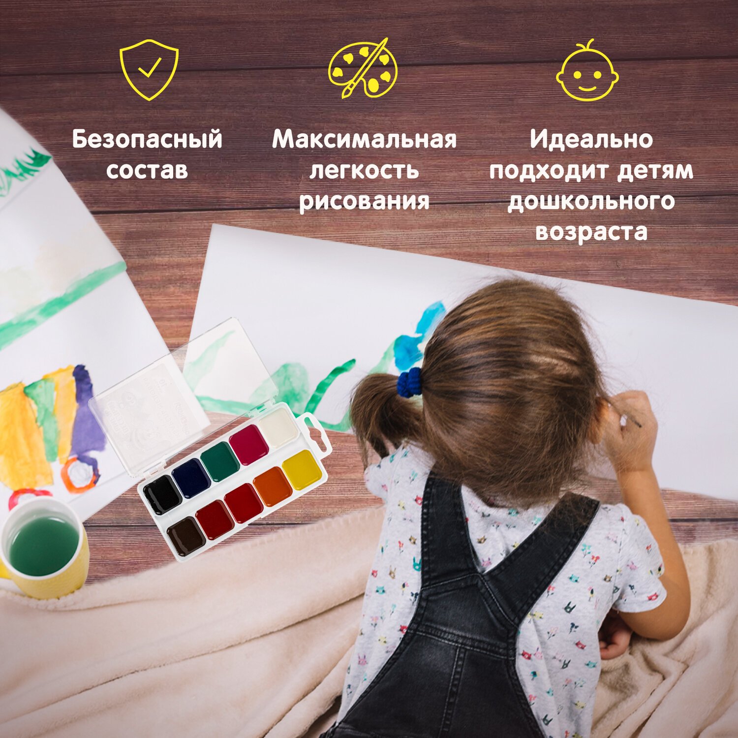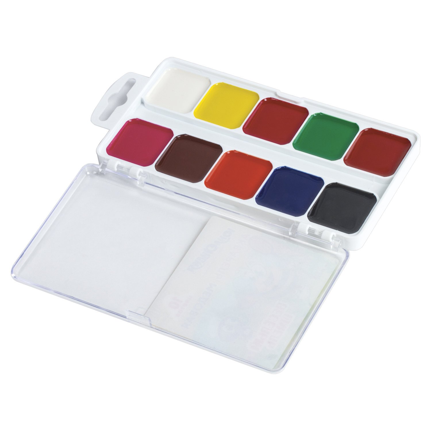 10 ярких насыщенных цветов отлично смешиваются между собой и позволяют создать множество оттенков, обеспечивают однородное окрашивание. Краски быстро высыхают и не портятся со временем. Безопасны для детей, нетоксичны. Выпускаются в пластиковом пенале с прозрачной крышкой, квадратной формой кювет и отделением для кисточки. Упаковка обладает компактными размерами и легким весом.