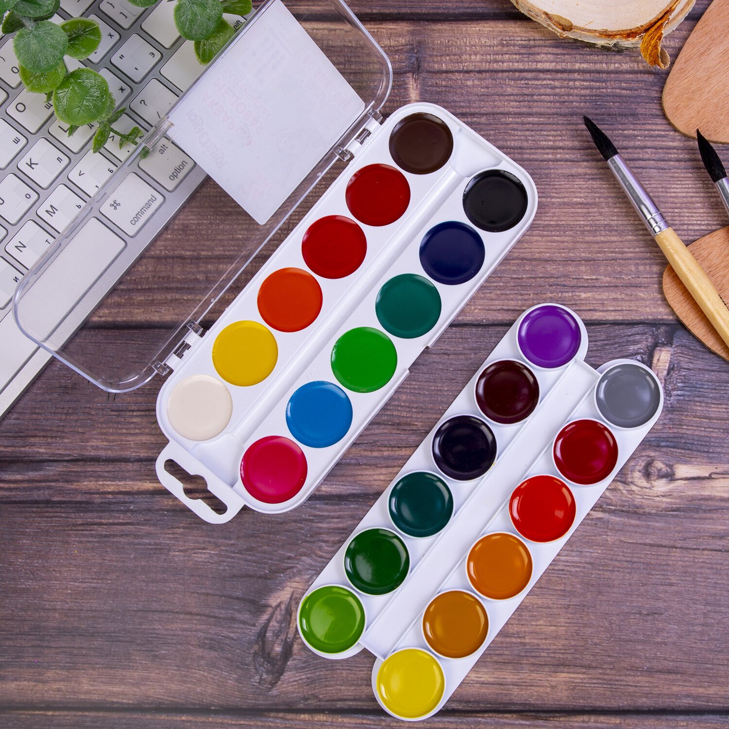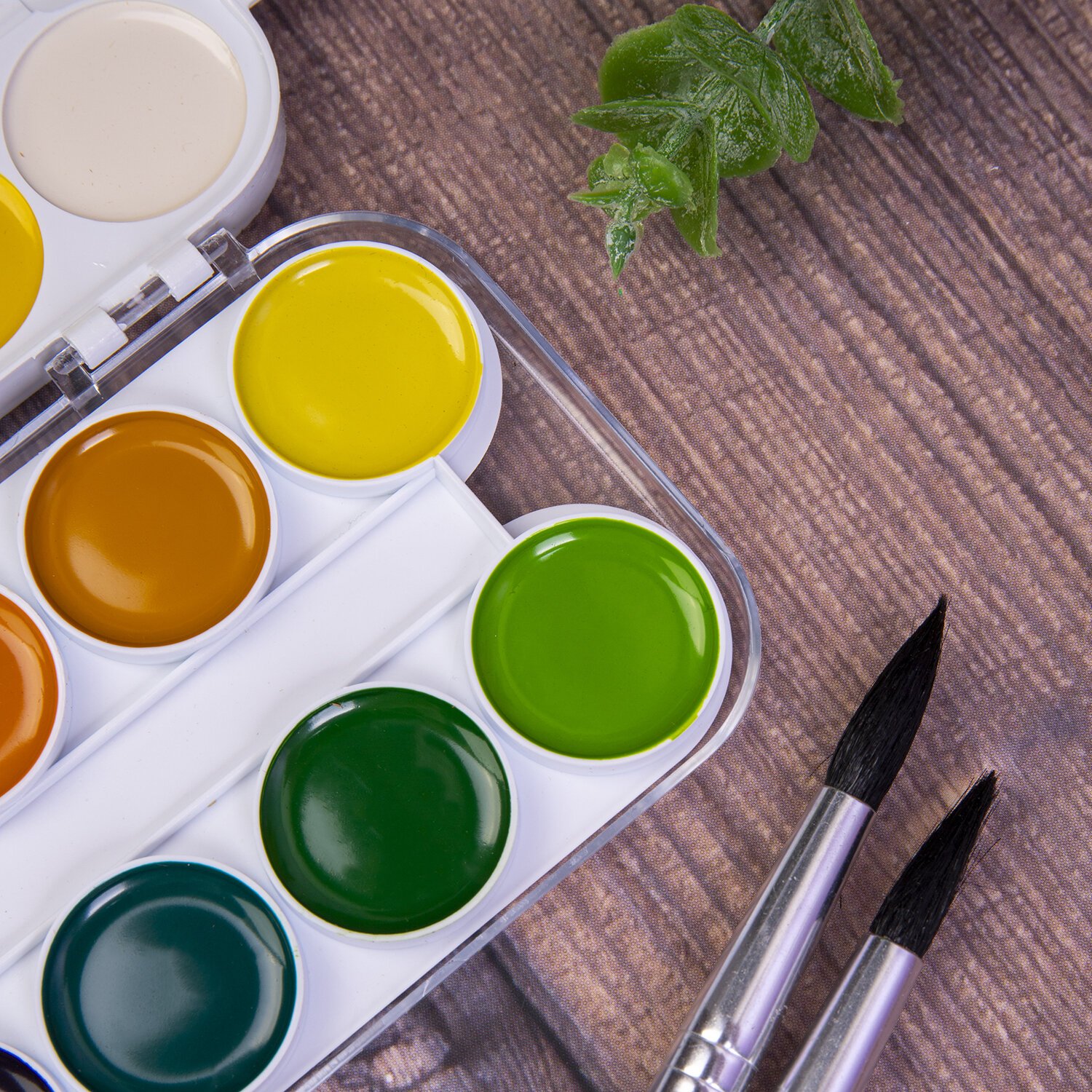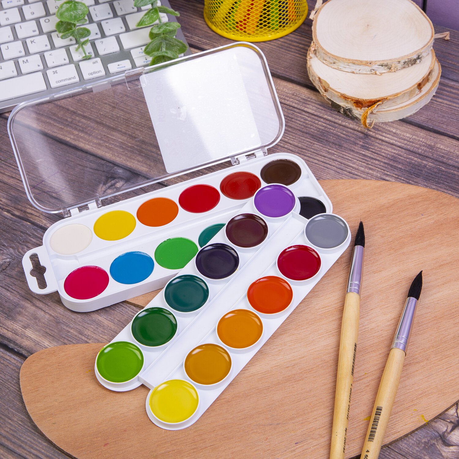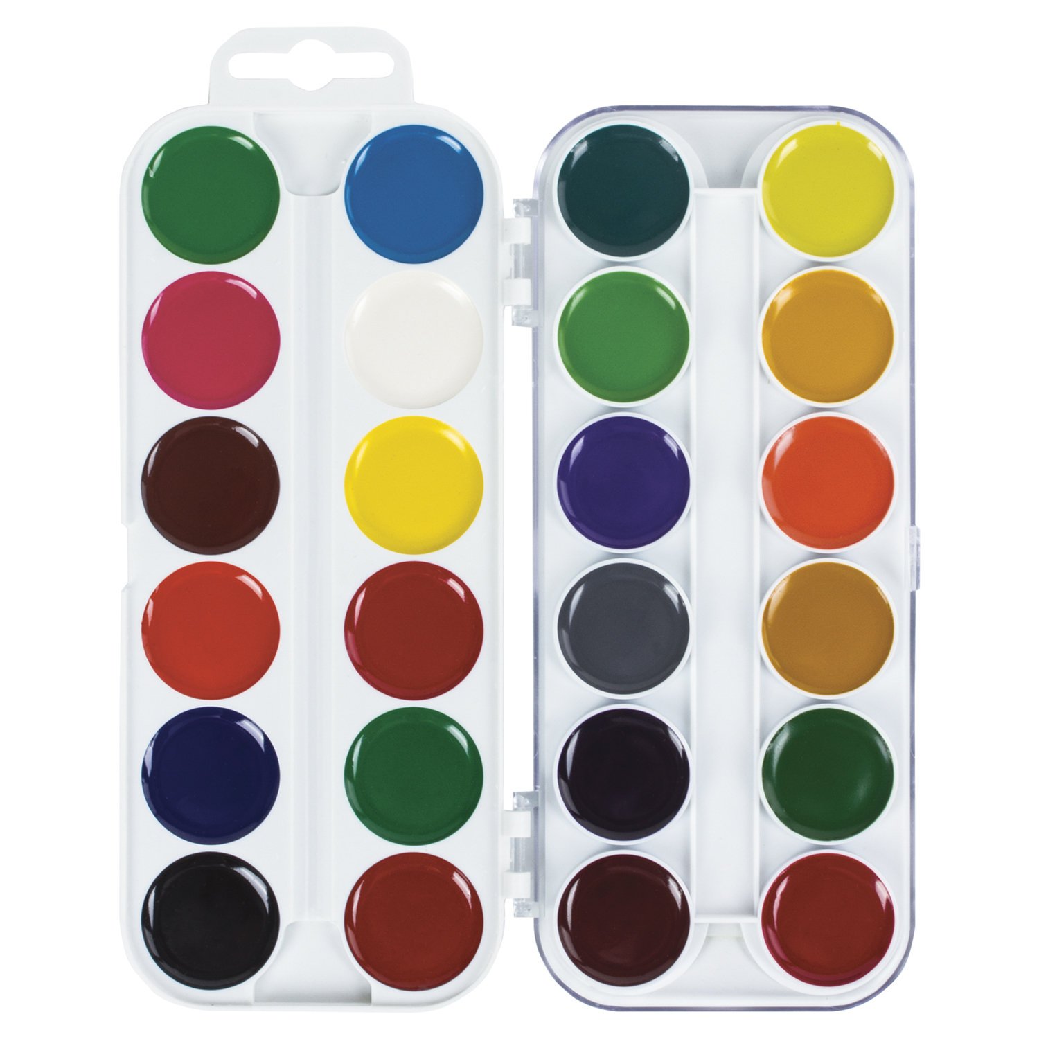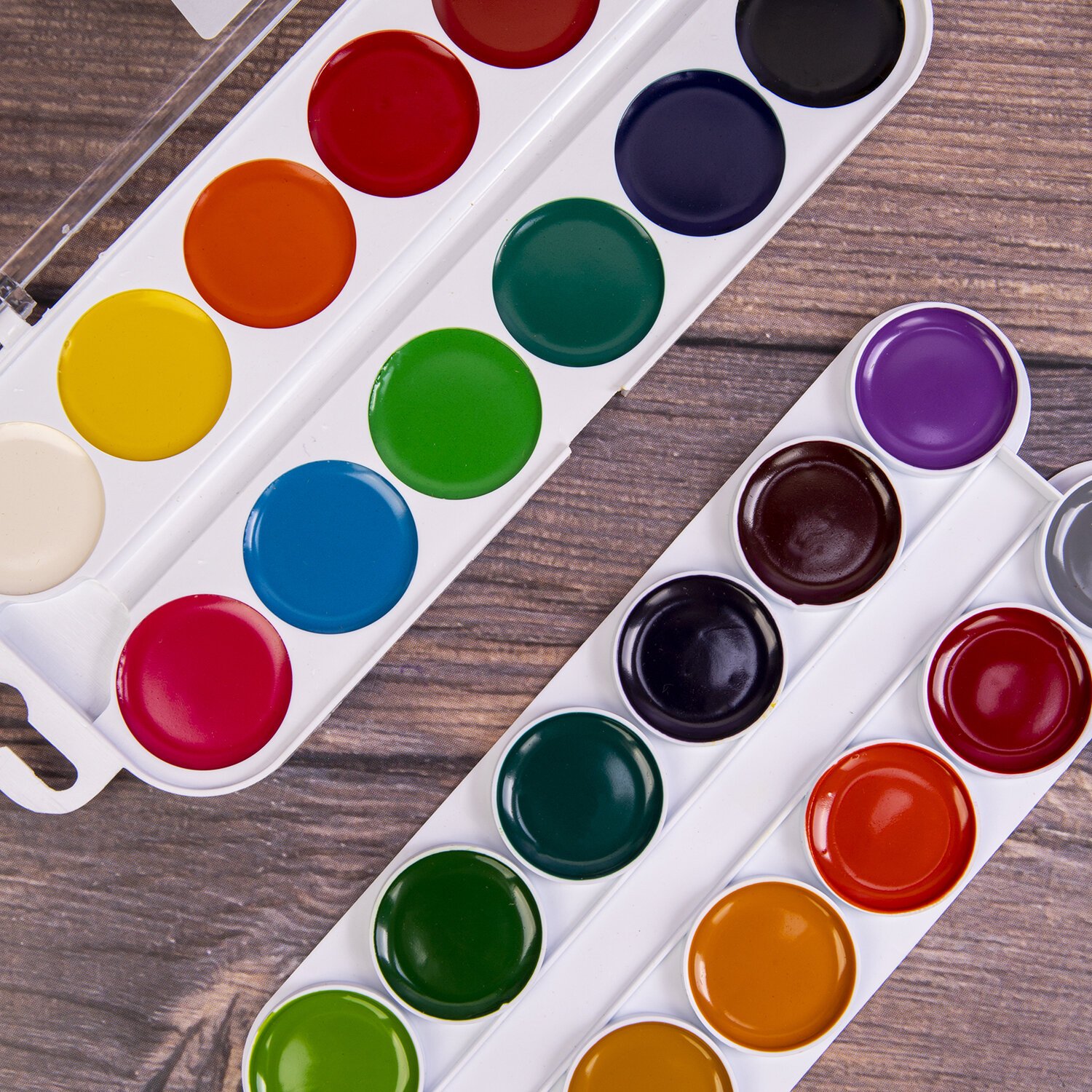 24 ярких насыщенных цвета отлично смешиваются между собой и позволяют создать множество оттенков, обеспечивают однородное окрашивание. Краски быстро высыхают и не портятся со временем. Безопасны для детей, нетоксичны. Выпускаются в пластиковом пенале с прозрачной крышкой, круглой формой кювет и отделением для кисточки. Упаковка обладает компактными размерами и легким весом.