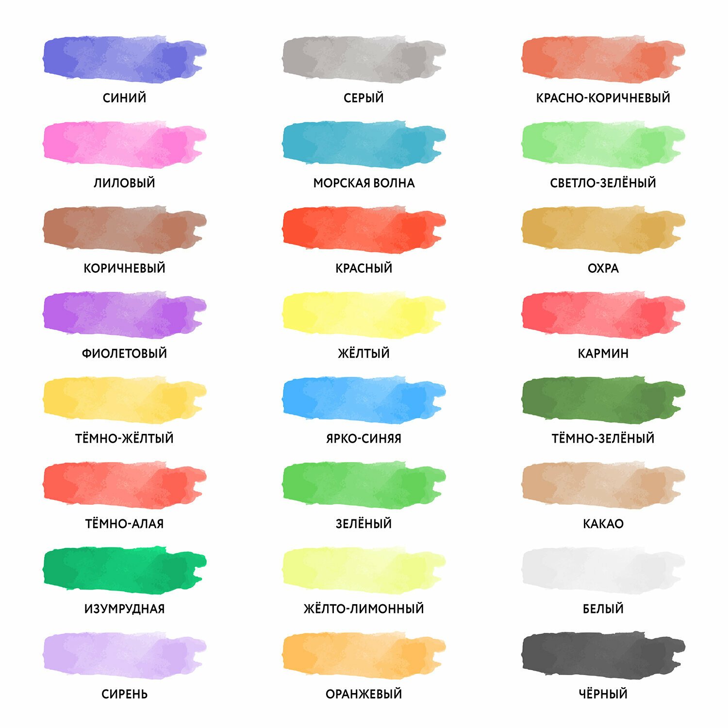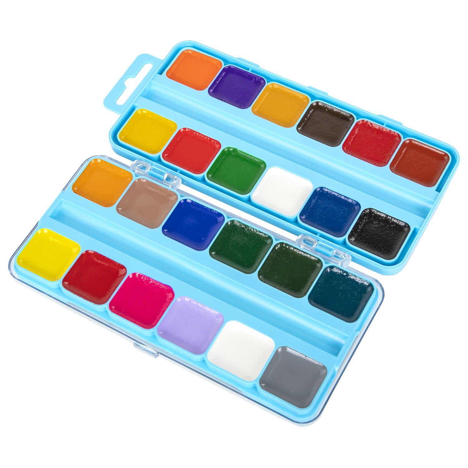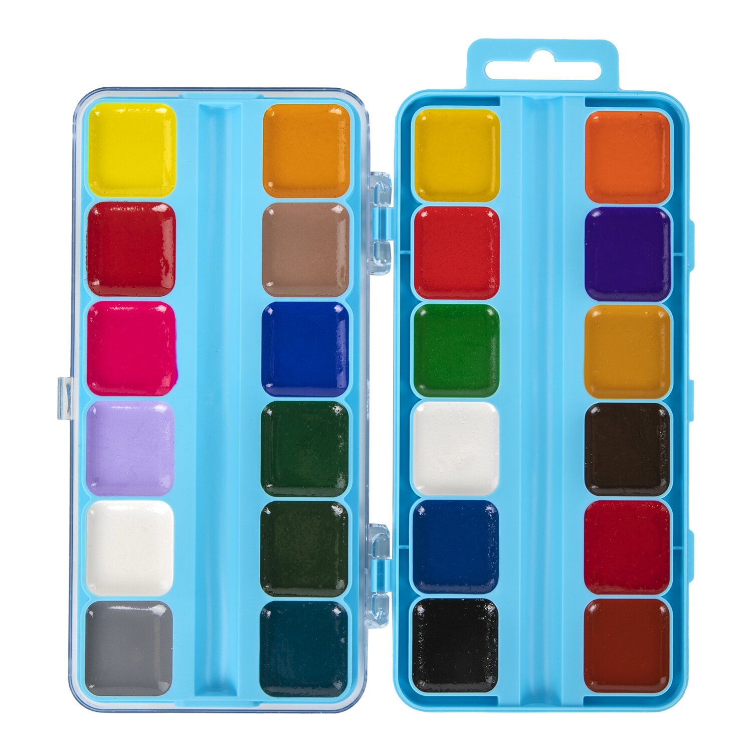 24 ярких насыщенных цвета отлично смешиваются между собой и позволяют создать множество оттенков, обеспечивают однородное окрашивание. Краски быстро высыхают и не портятся со временем. Безопасны для детей, нетоксичны. Выпускаются в пластиковом пенале с прозрачной крышкой, квадратной формой кювет и отделением для кисточки. Упаковка обладает компактными размерами и легким весом.