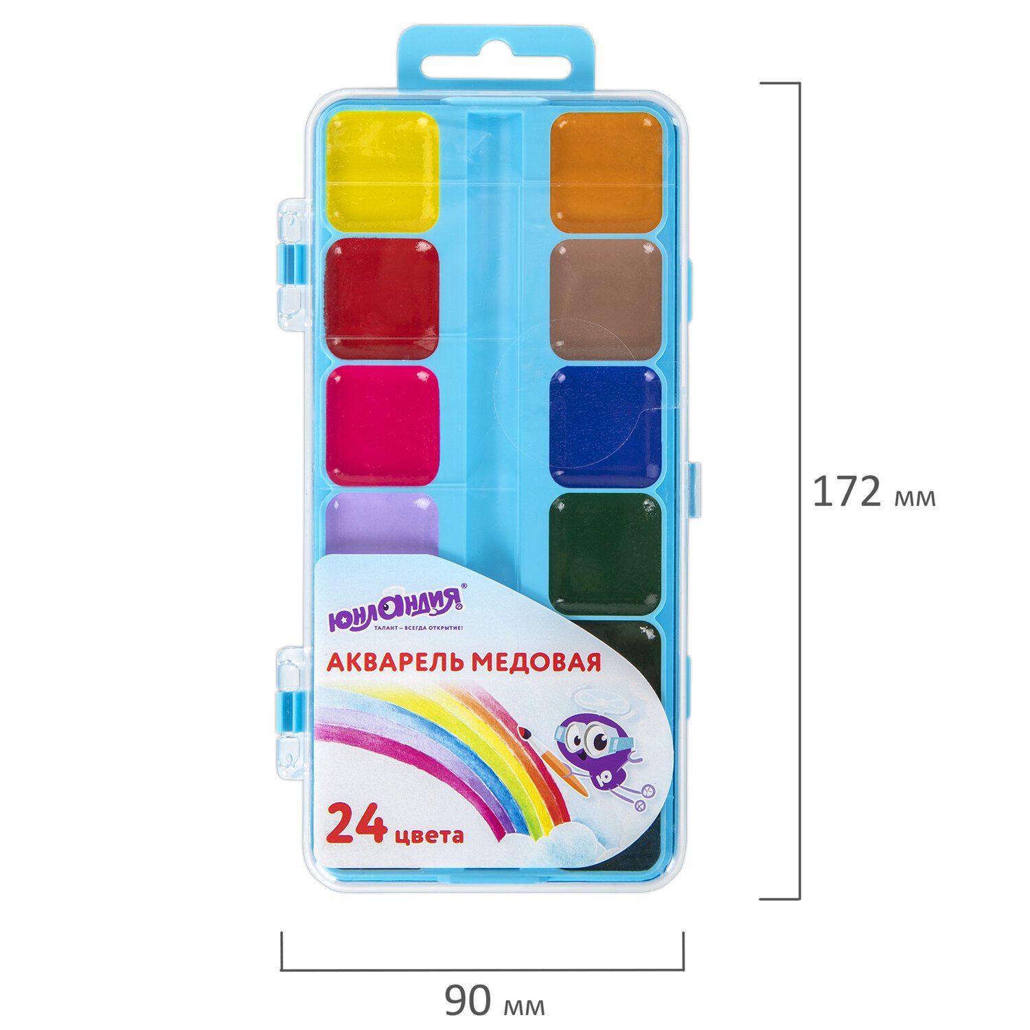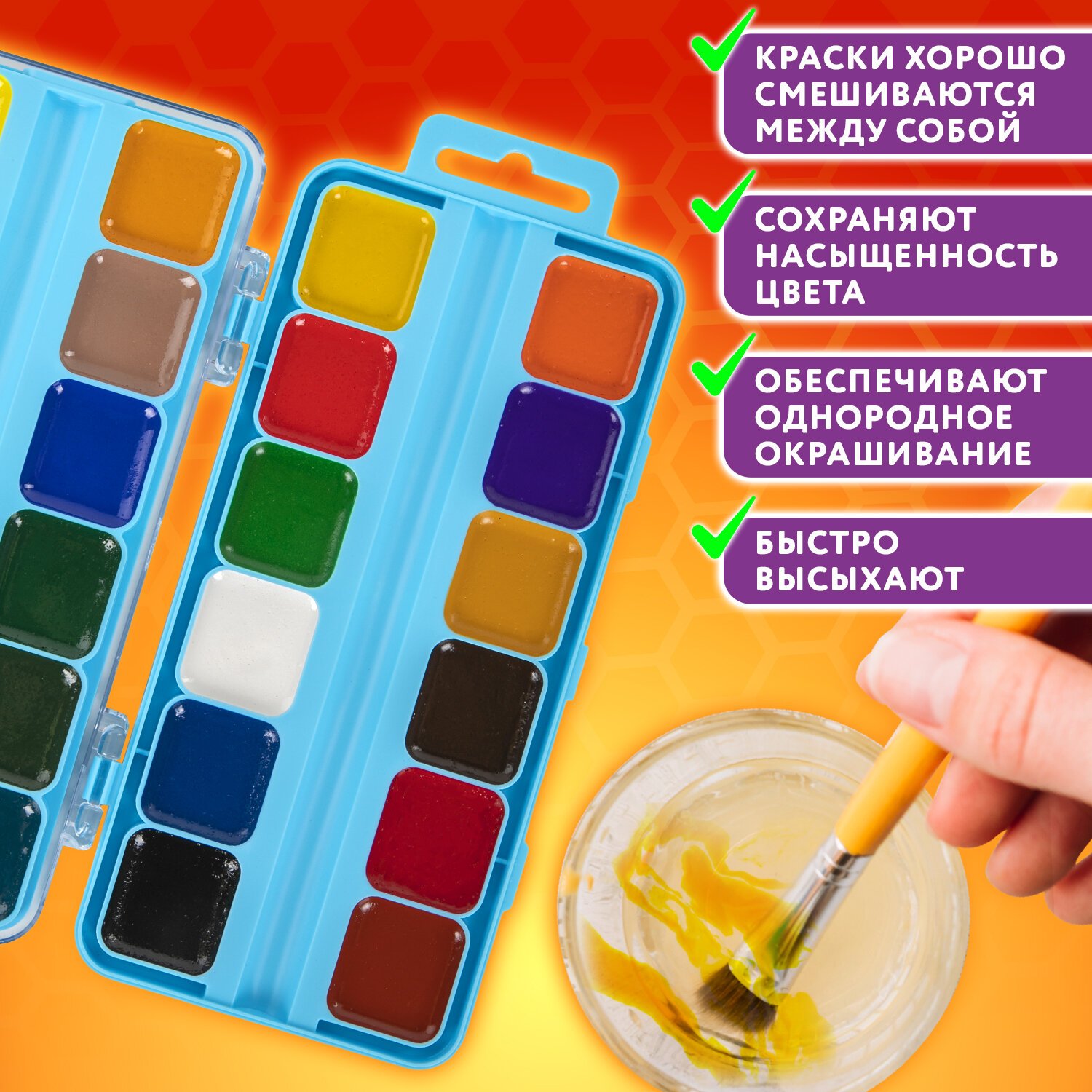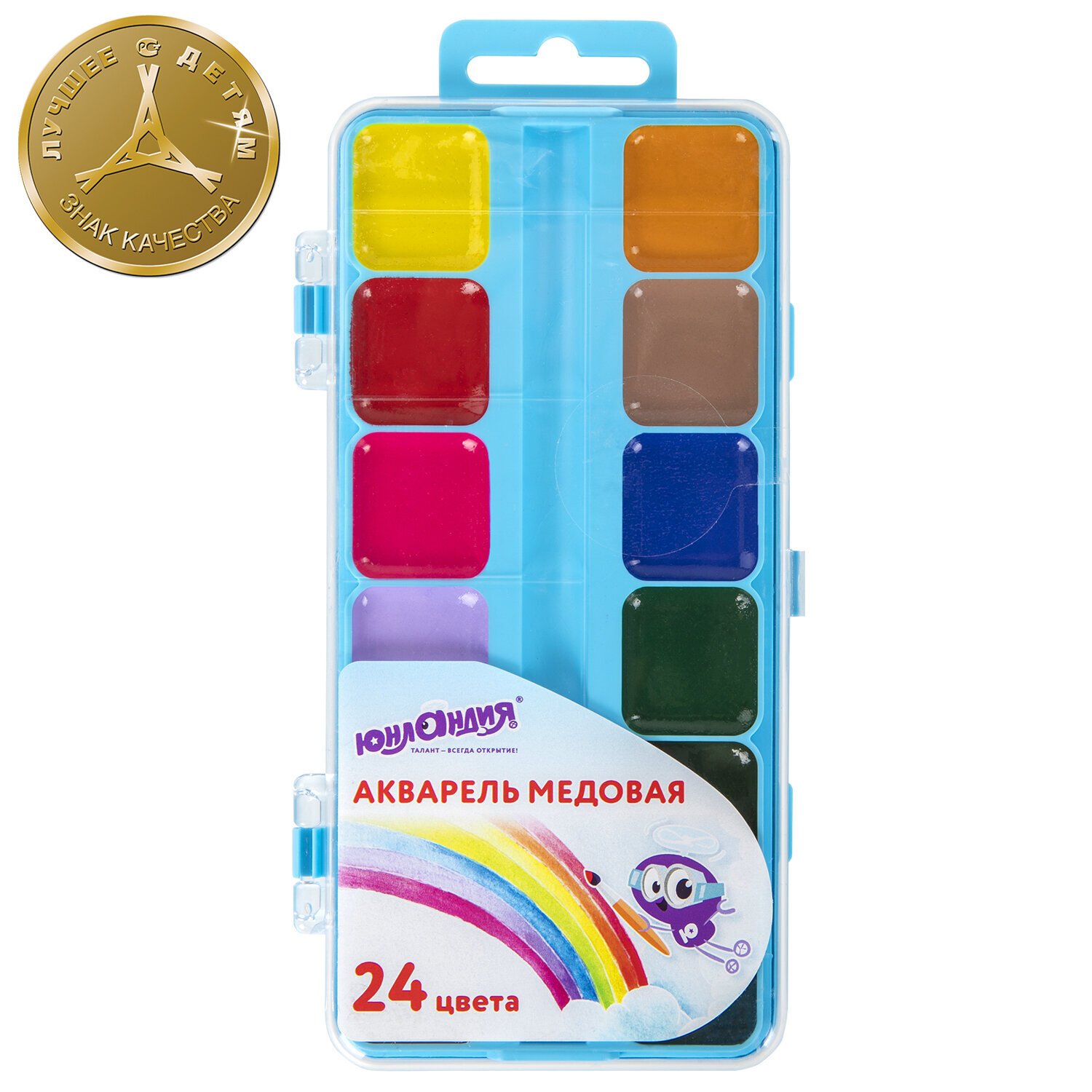 Краски акварельные BRAUBERG KIDS, медовые, 24 цвета, квадратные кюветы, пластиковый пенал, 192284