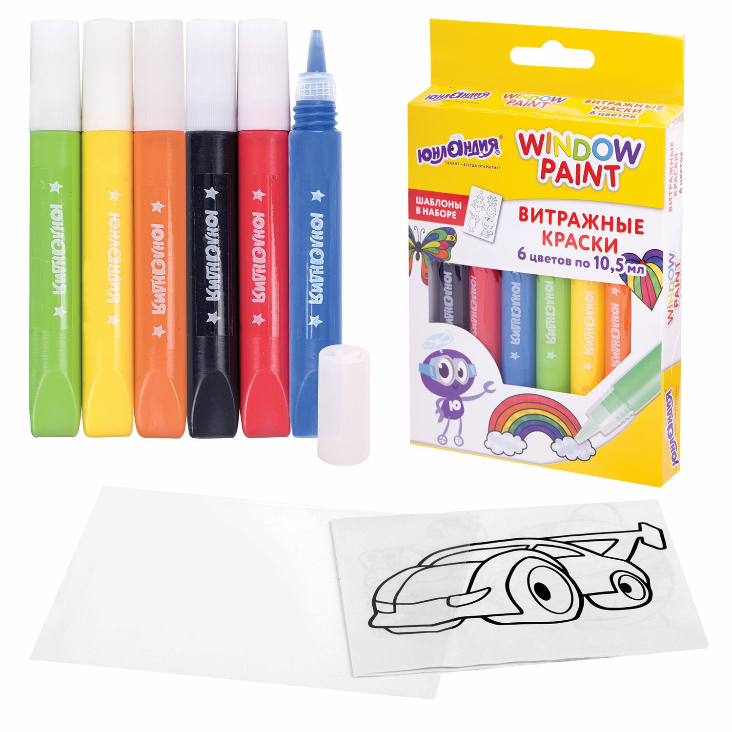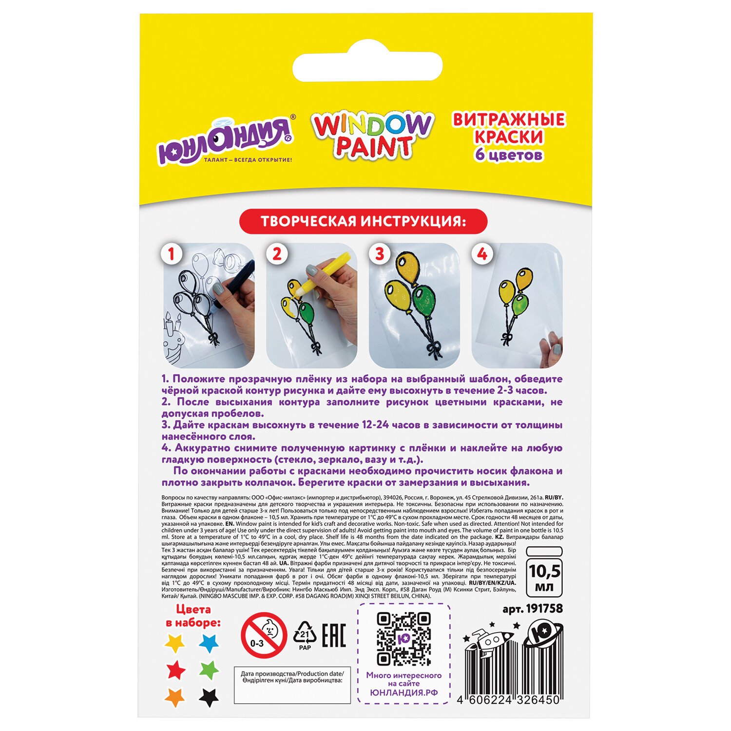 Краски витражные ЮНЛАНДИЯ, 6 ярких цветов, 6 туб по 10,5 мл, шаблоны, 191758