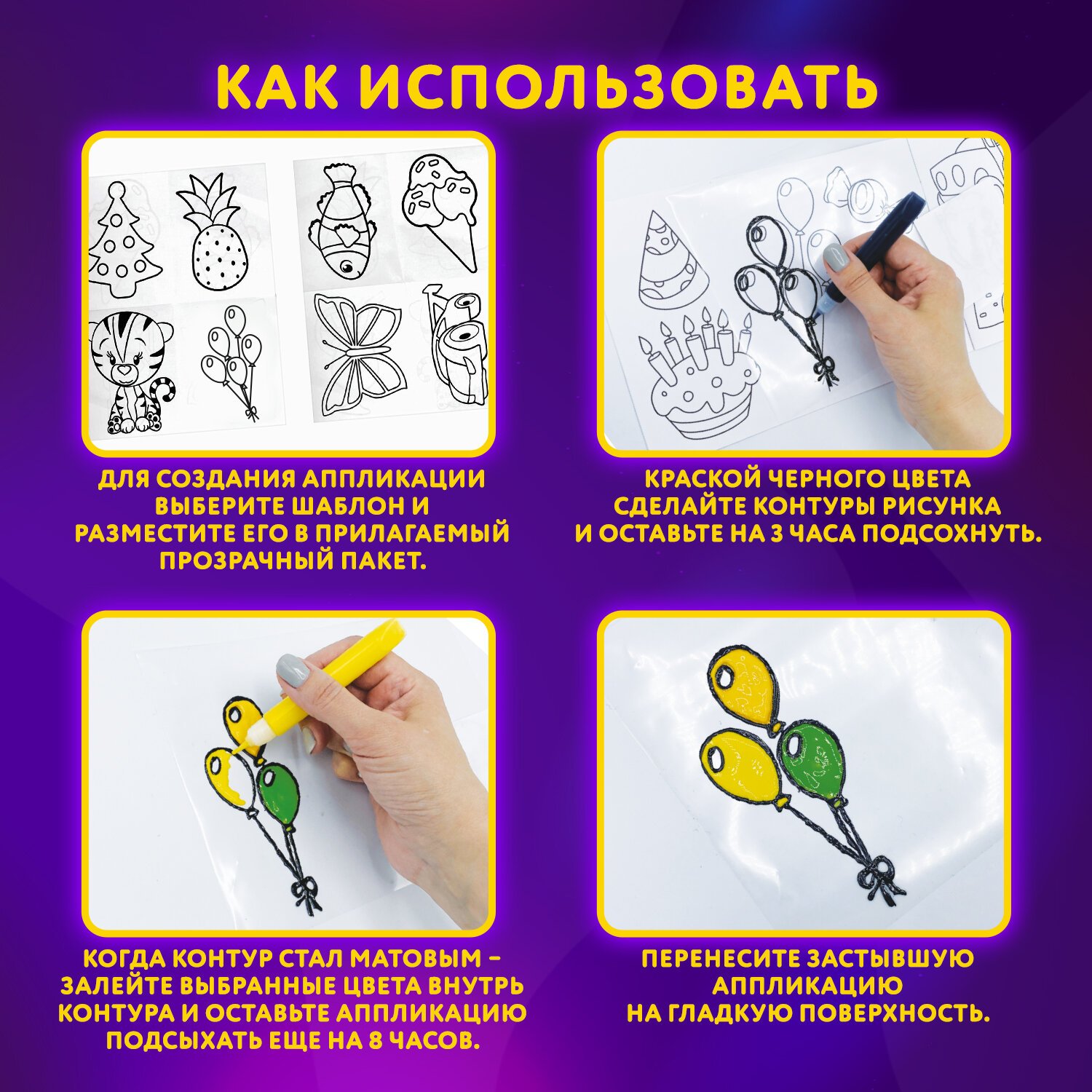 Для создания аппликации выберите шаблон и разместите его в прилагаемый прозрачный пакет, краской черного цвета сделайте контуры рисунка и оставьте на 3 часа подсохнуть. Когда контур стал матовым – залейте выбранные цвета внутрь контура и оставьте аппликацию подсыхать еще на 8 часов. Для получения желаемого оттенка при смешивании цветов можно воспользоваться зубочисткой (в комплект не входит). Перенесите застывшую аппликацию на гладкую вертикальную поверхность.