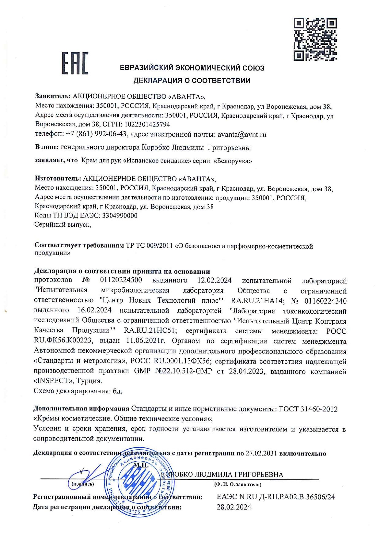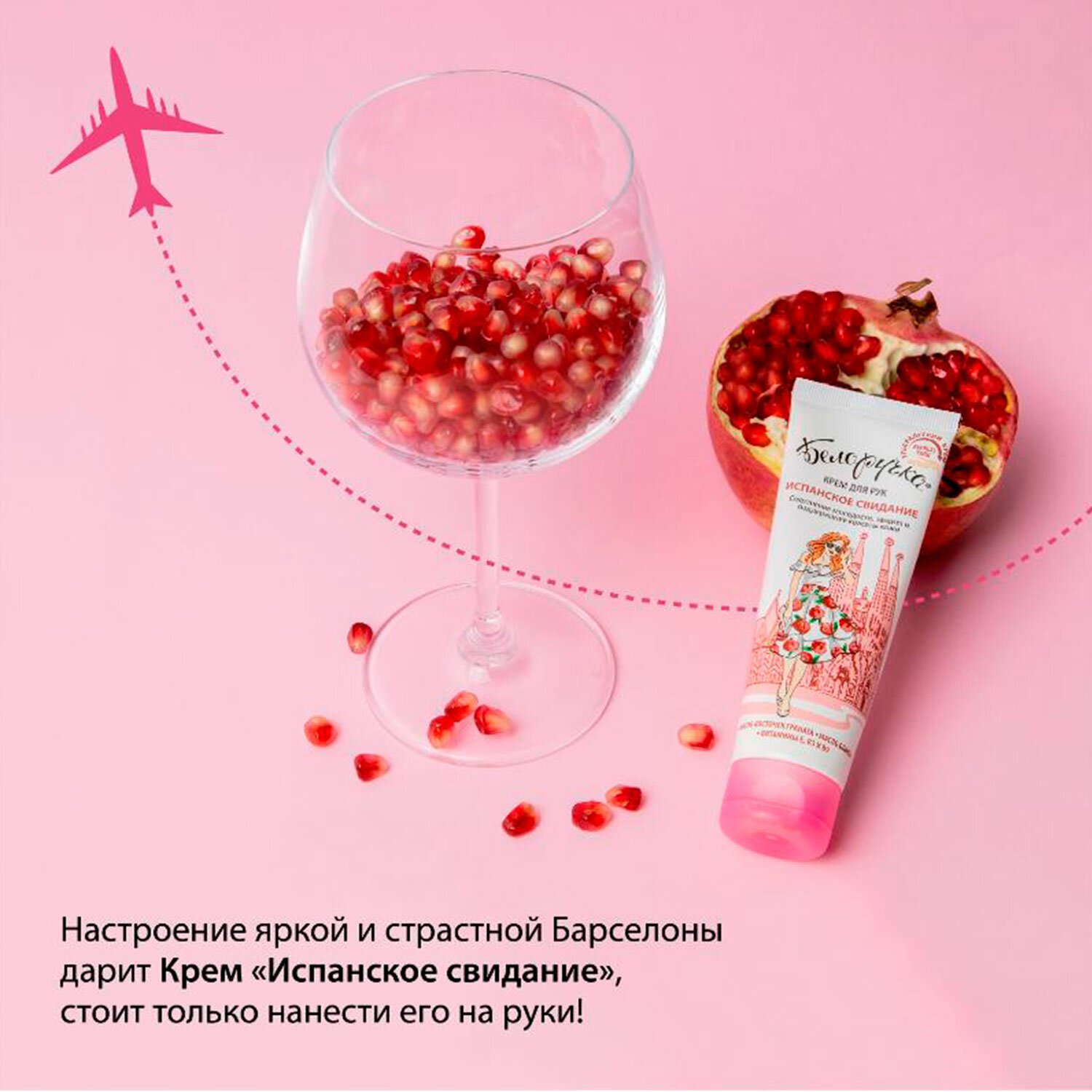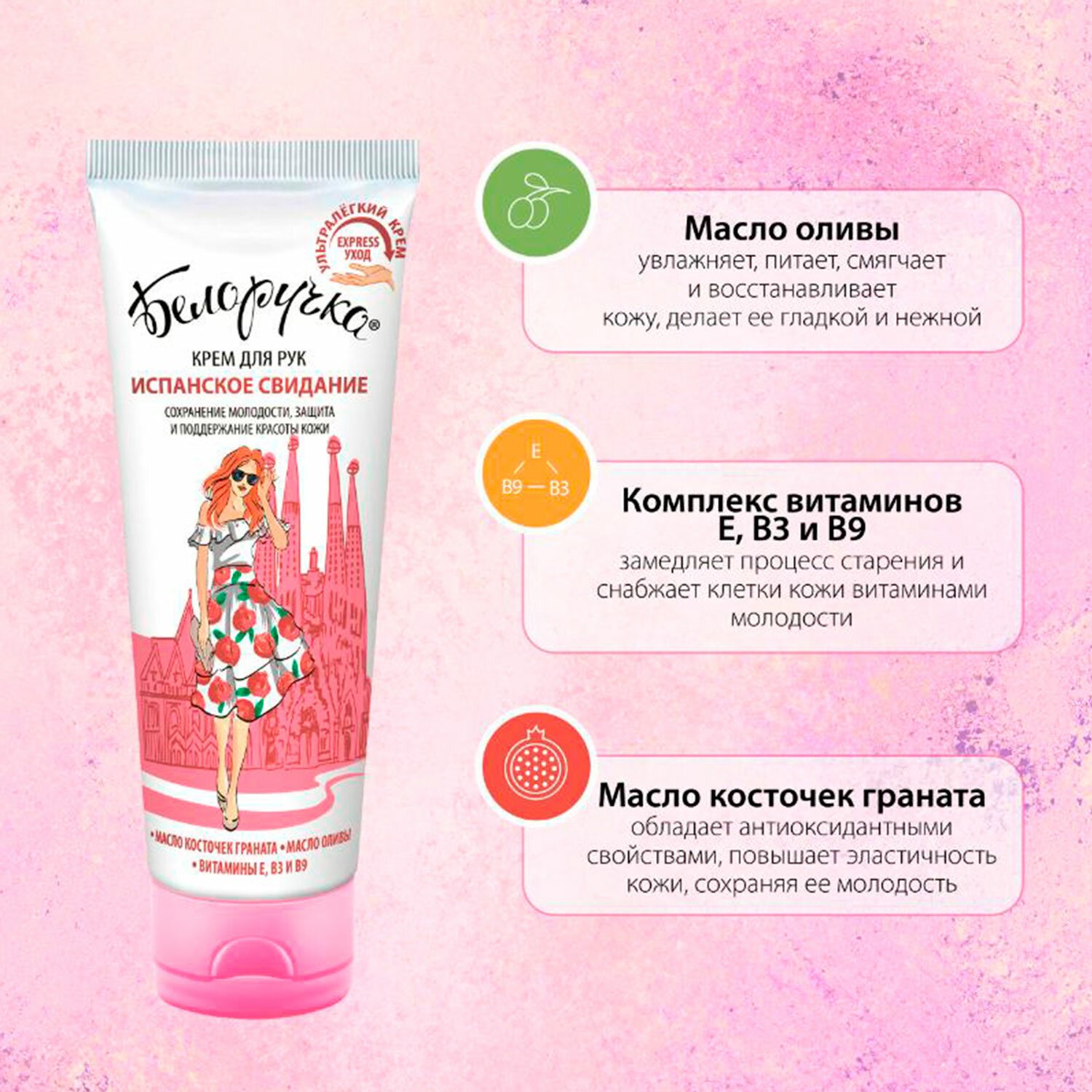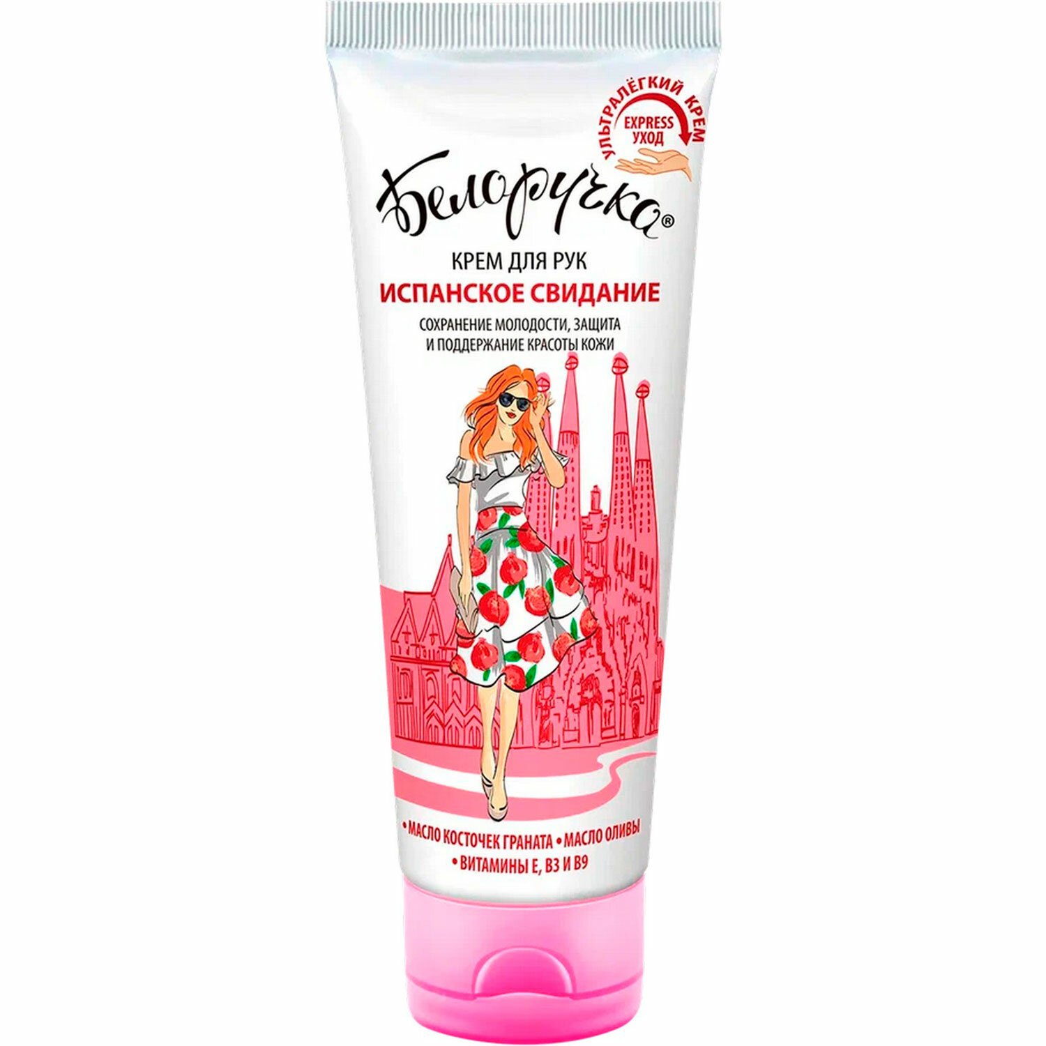 Крем для рук БЕЛОРУЧКА "Испанское свидание" питает кожу, стимулирует ее обновление, обеспечивает антиоксидантную защиту и способствует сохранению молодости и красоты.