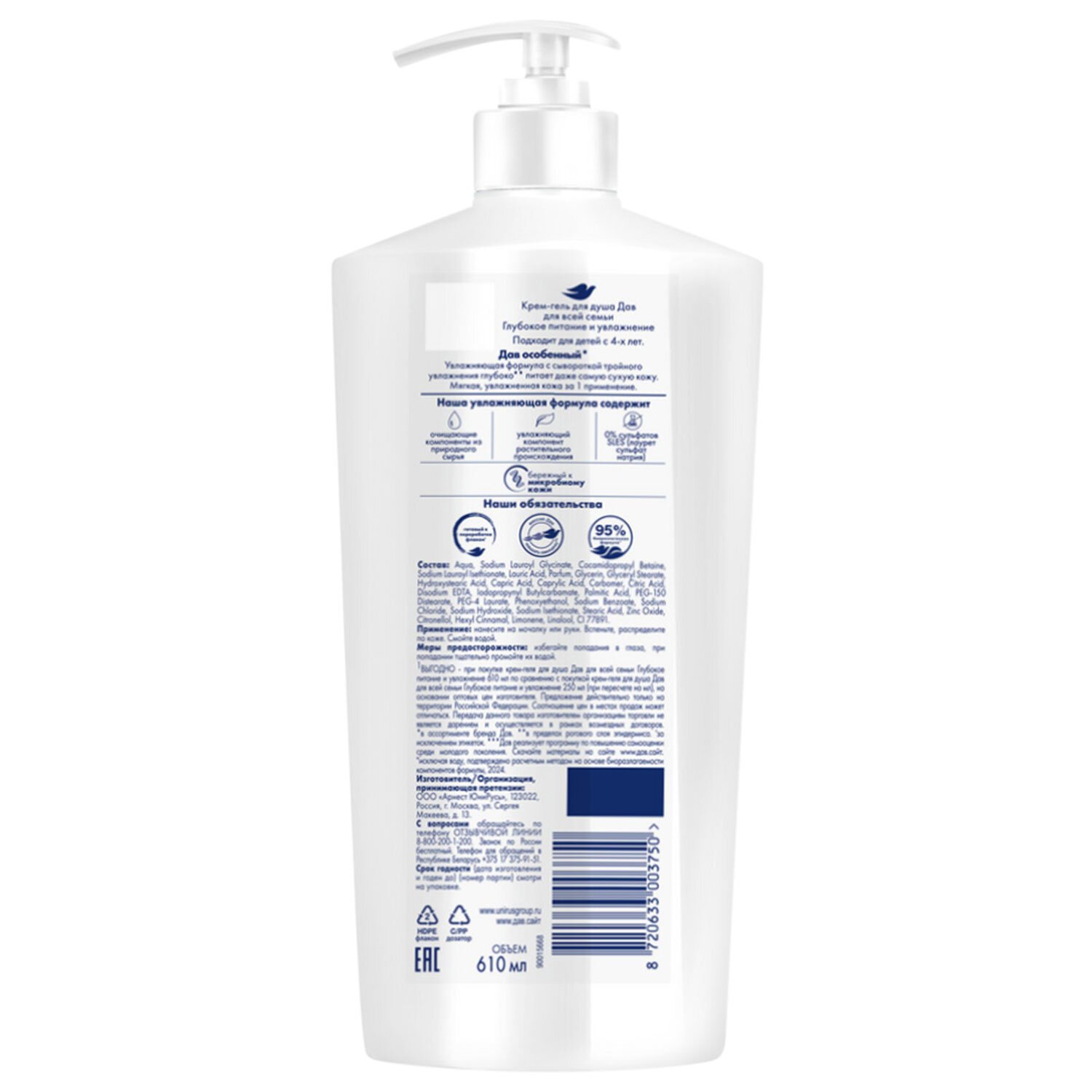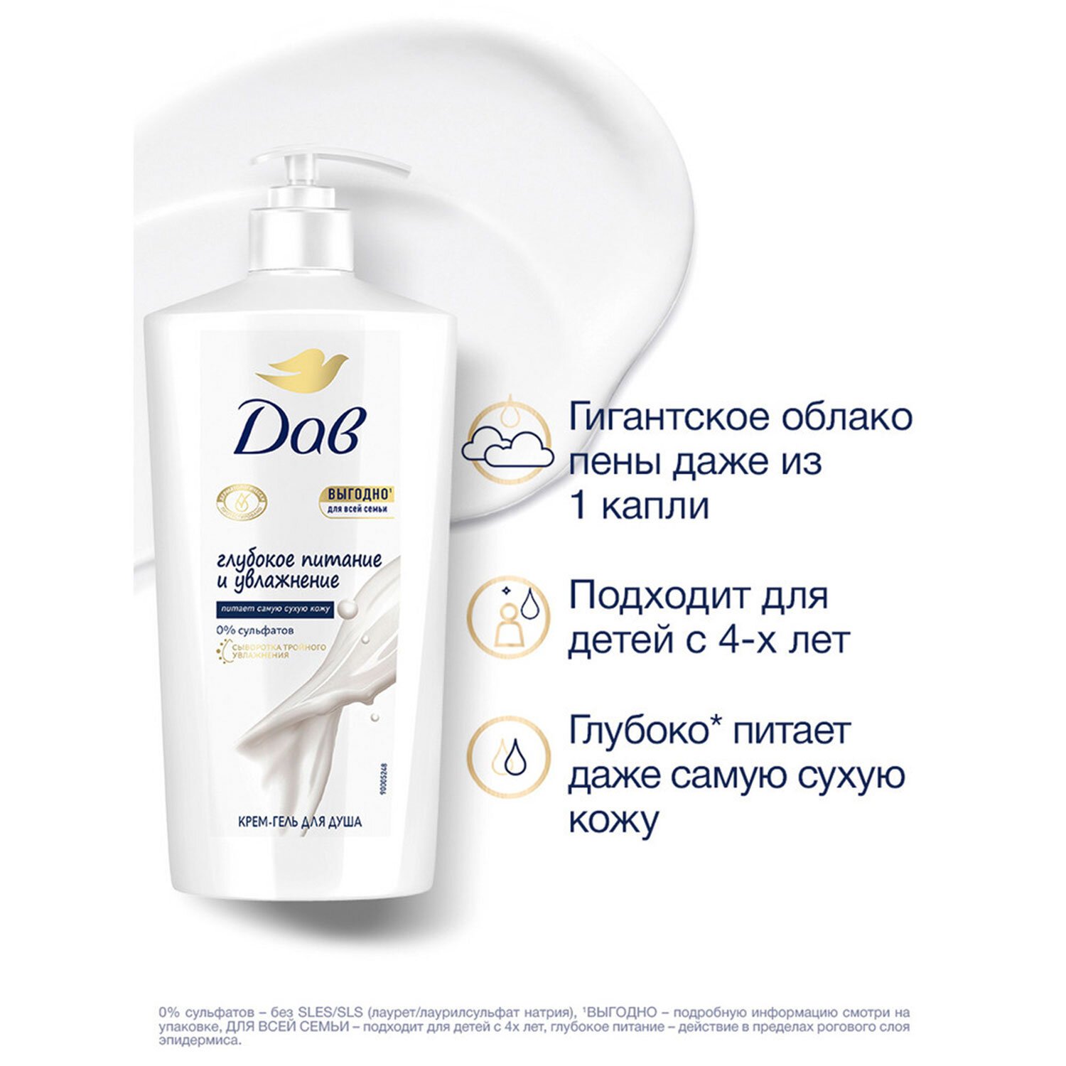 Крем-гель для душа DOVE "Глубокое питание и увлажнение" интенсивно питает и увлажняет даже самую сухую кожу. Подходит для всей семьи, в том числе детей с 4 лет.