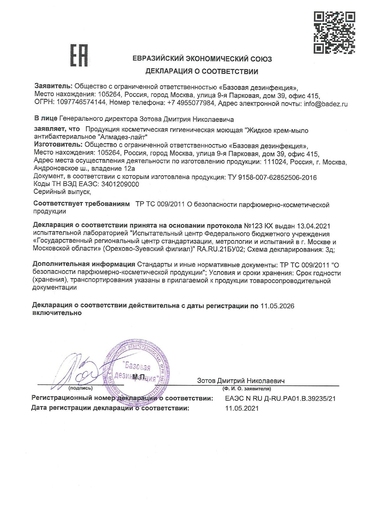 Крем-мыло антибактериальное АЛМАДЕЗ-ЛАЙТ представляет собой гелеобразную жидкость белого цвета с легким запахом применяемой отдушки.