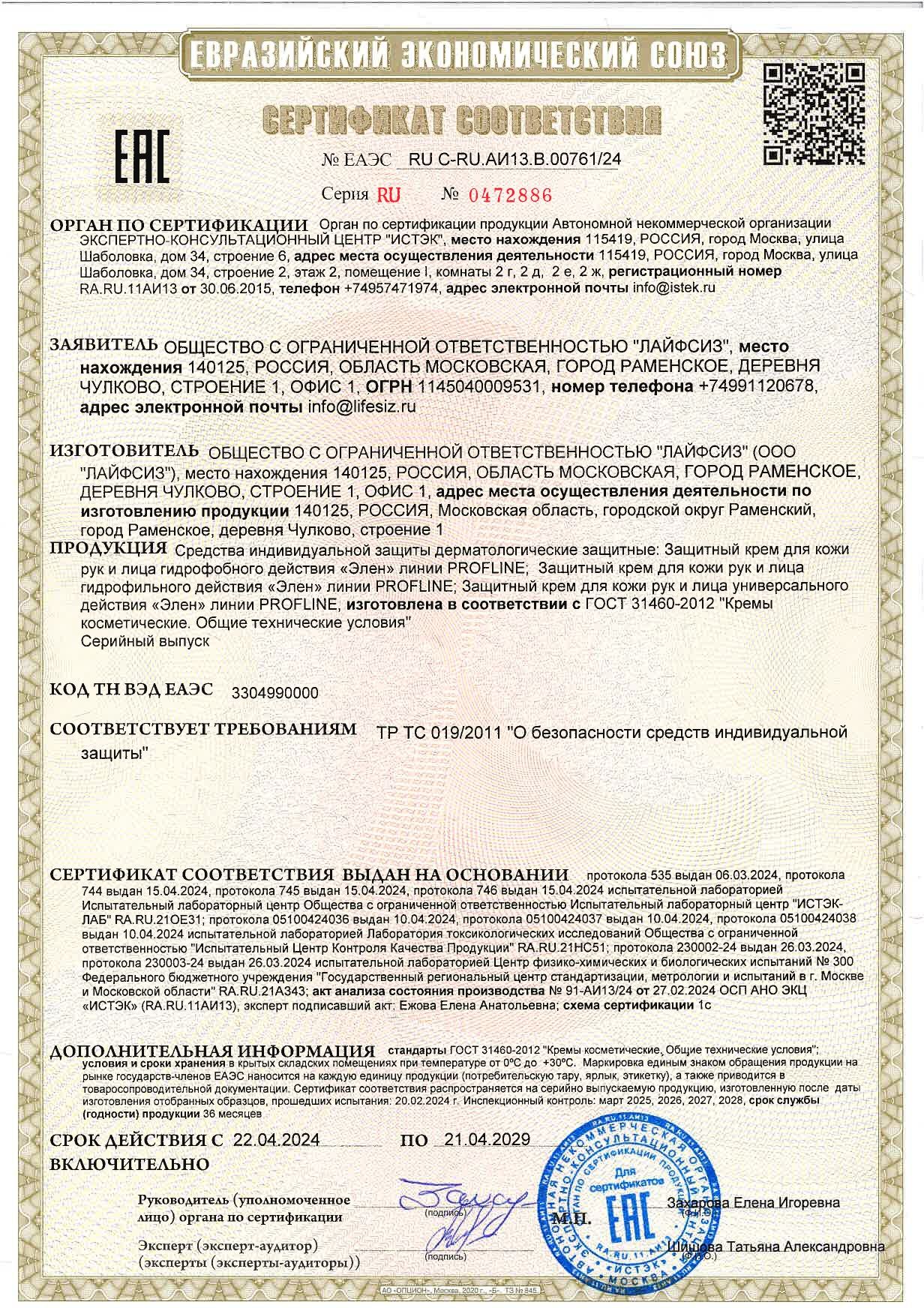 Крем защитный, 100 мл, ЭЛЕН, гидрофобный, от кислотных и щелочных средств, смазочно-охлаждающих жидкостей