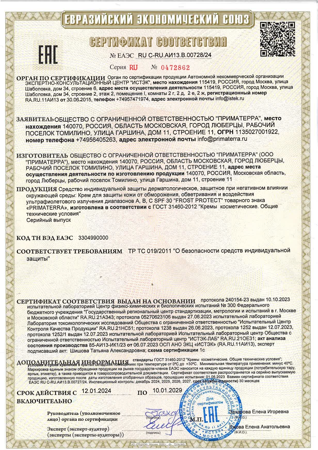 Крем защитный PRIMATERRA FROST PROTECT предназначен для защиты кожи лица и рук от неблагоприятных воздействий окружающей среды: мороза, холодной ветреной погода, ультрафиолетового излучения. Крем легко наносится на кожу, не создает неудобств при работе.