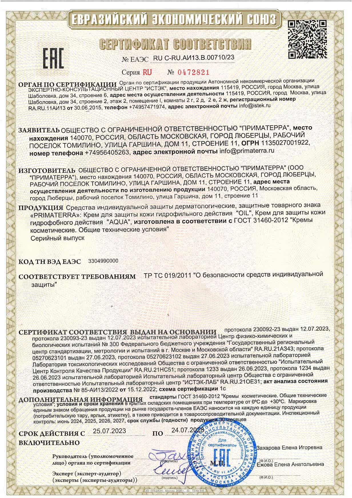 Крем PRIMATERRA OIL эффективно защищает кожу и облегчает ее очистку от масляных и сажевых загрязнений, в том числе нефти, мазута, битума, жира, графита, металлической пыли, СОЖ, масел минеральных нефтяных, лаков, красок, клея, смол, сажи.