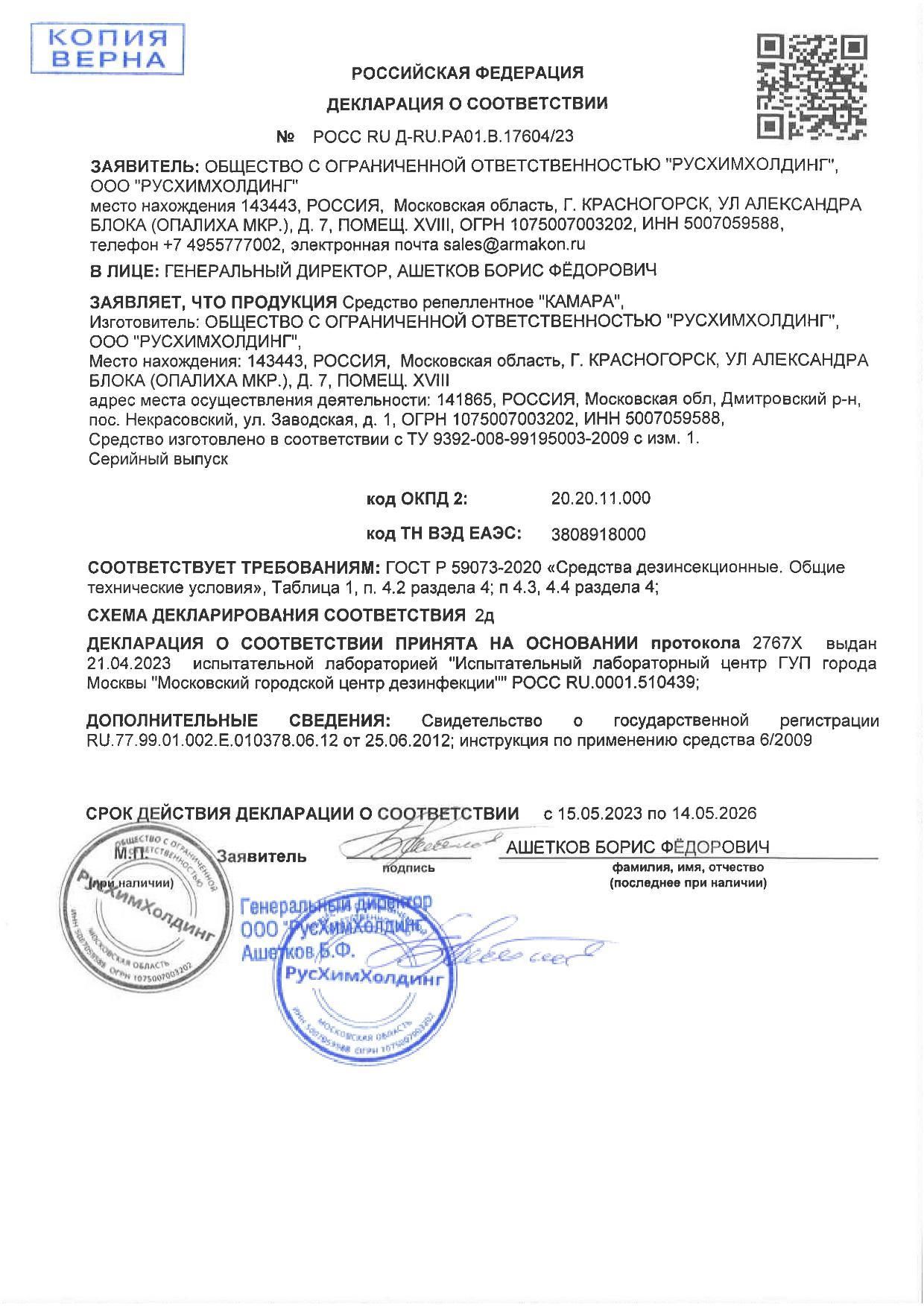 АРМАКОН КАМАРА относится к высшей категории эффективности репеллентных средств, эффективность продукта поддерживается в течение минимум 4 часов (подтверждено институтом НИИ дезинфектологии). Не содержит силиконов, красителей, парабенов, отдушки.
