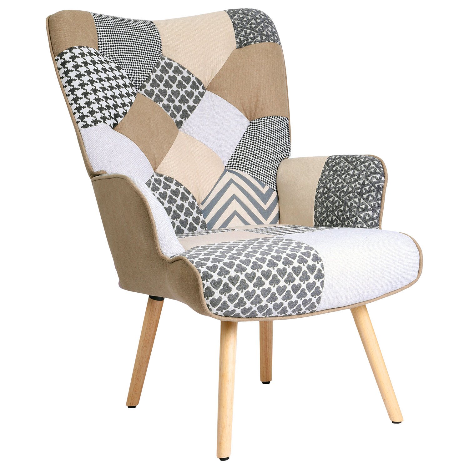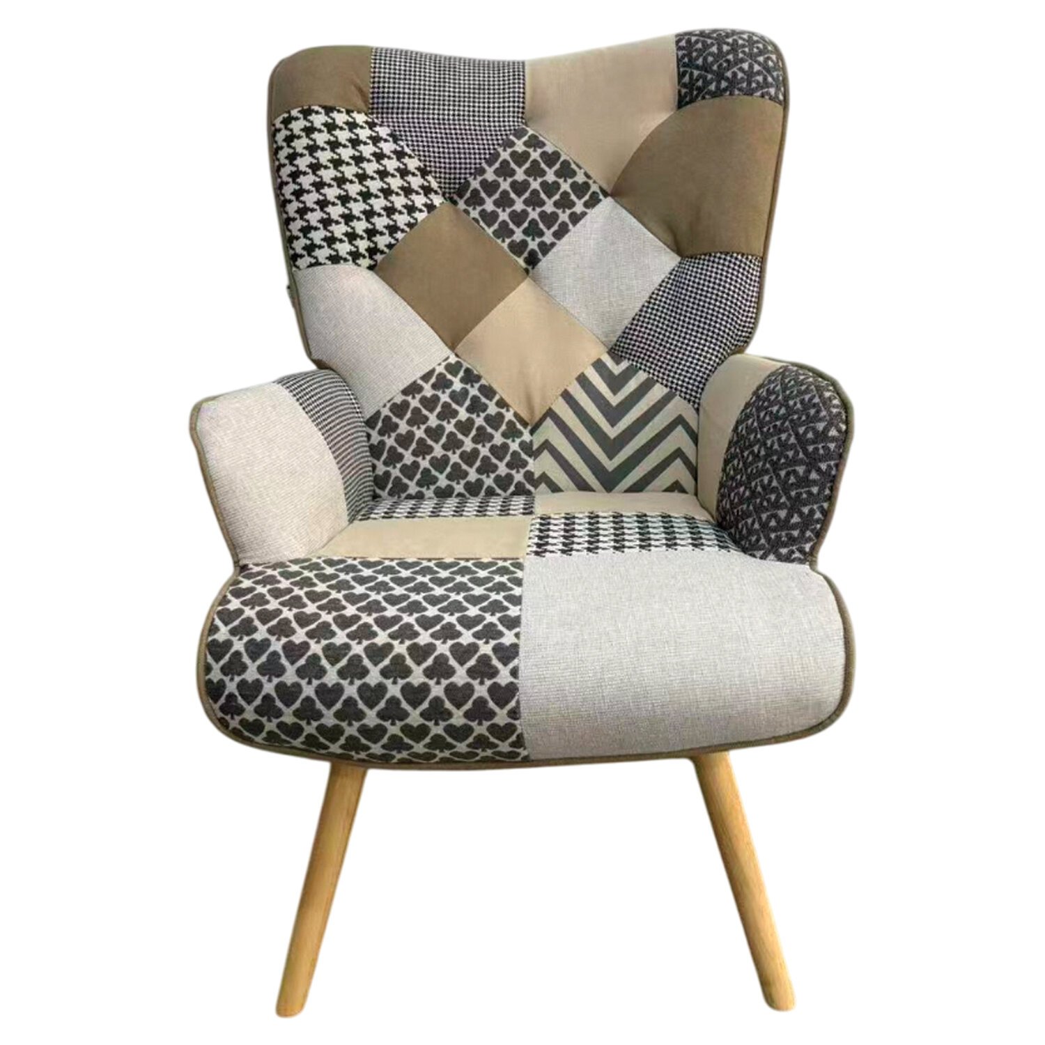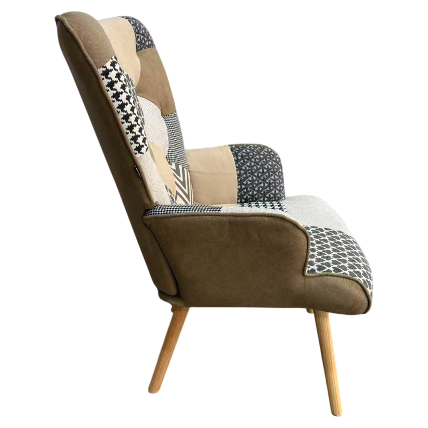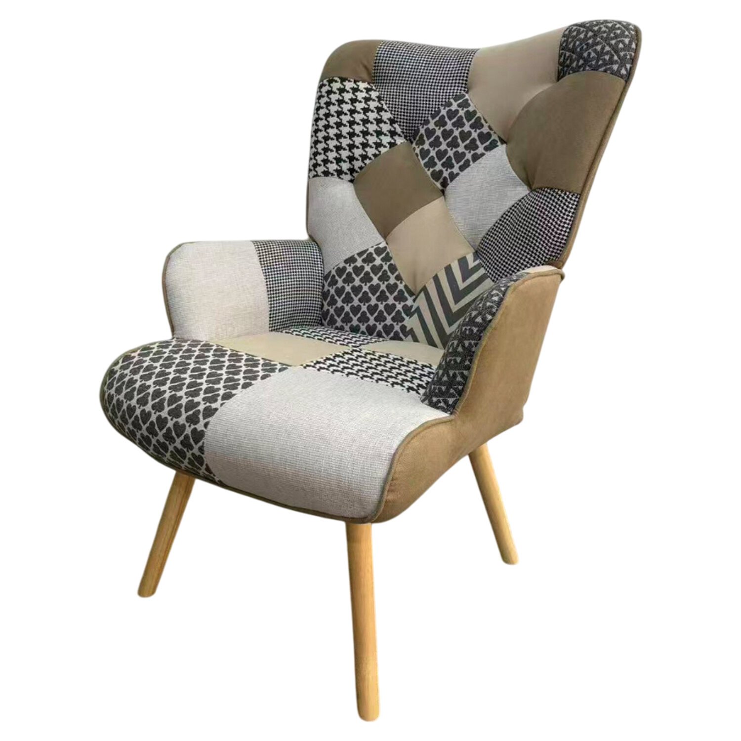 Обивка кресла выполнена из ткани с принтом в виде лоскутов. Она имеет приятные тактильные качества, легко чистится и хорошо пропускает воздух.