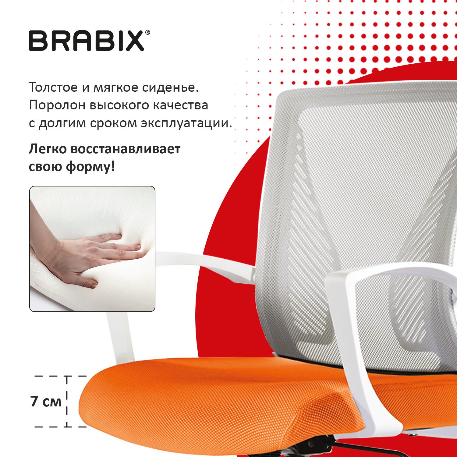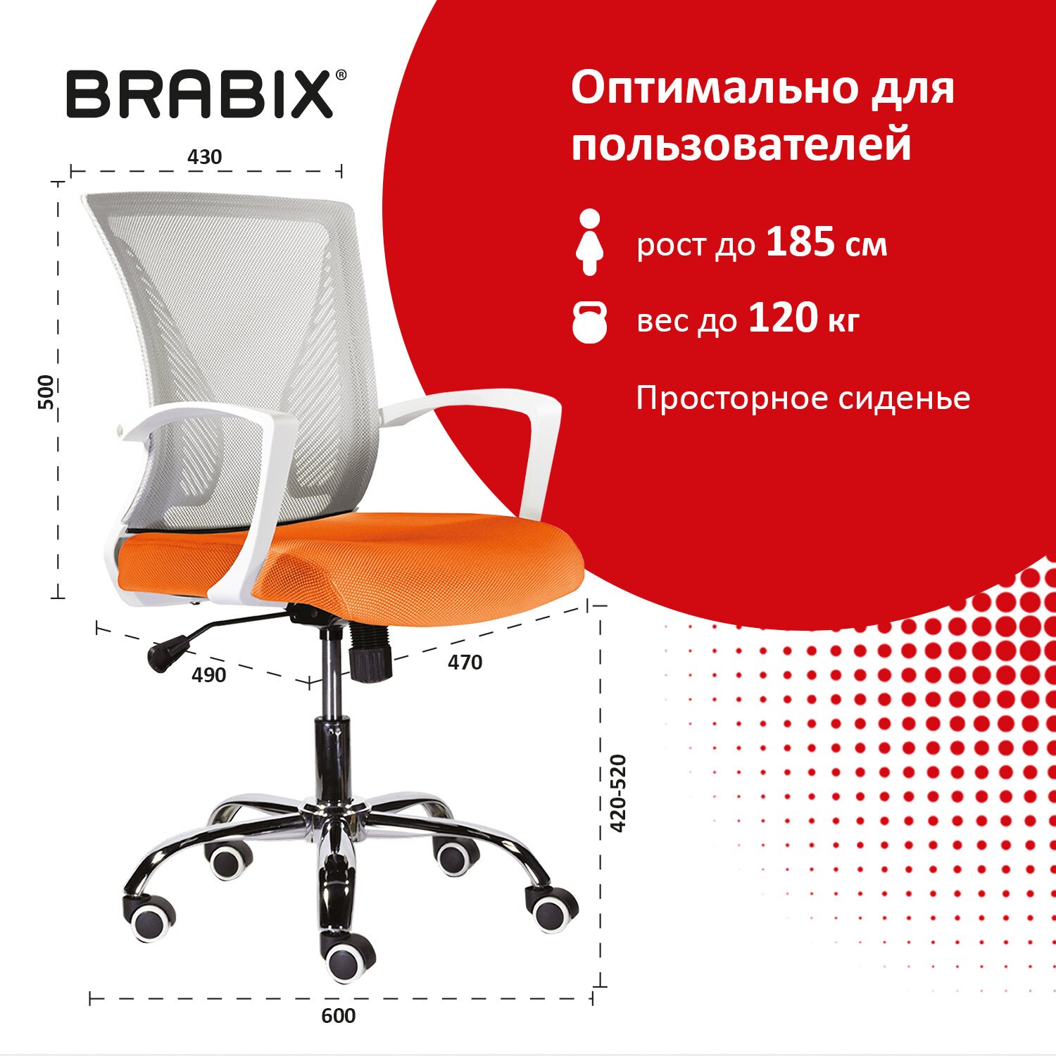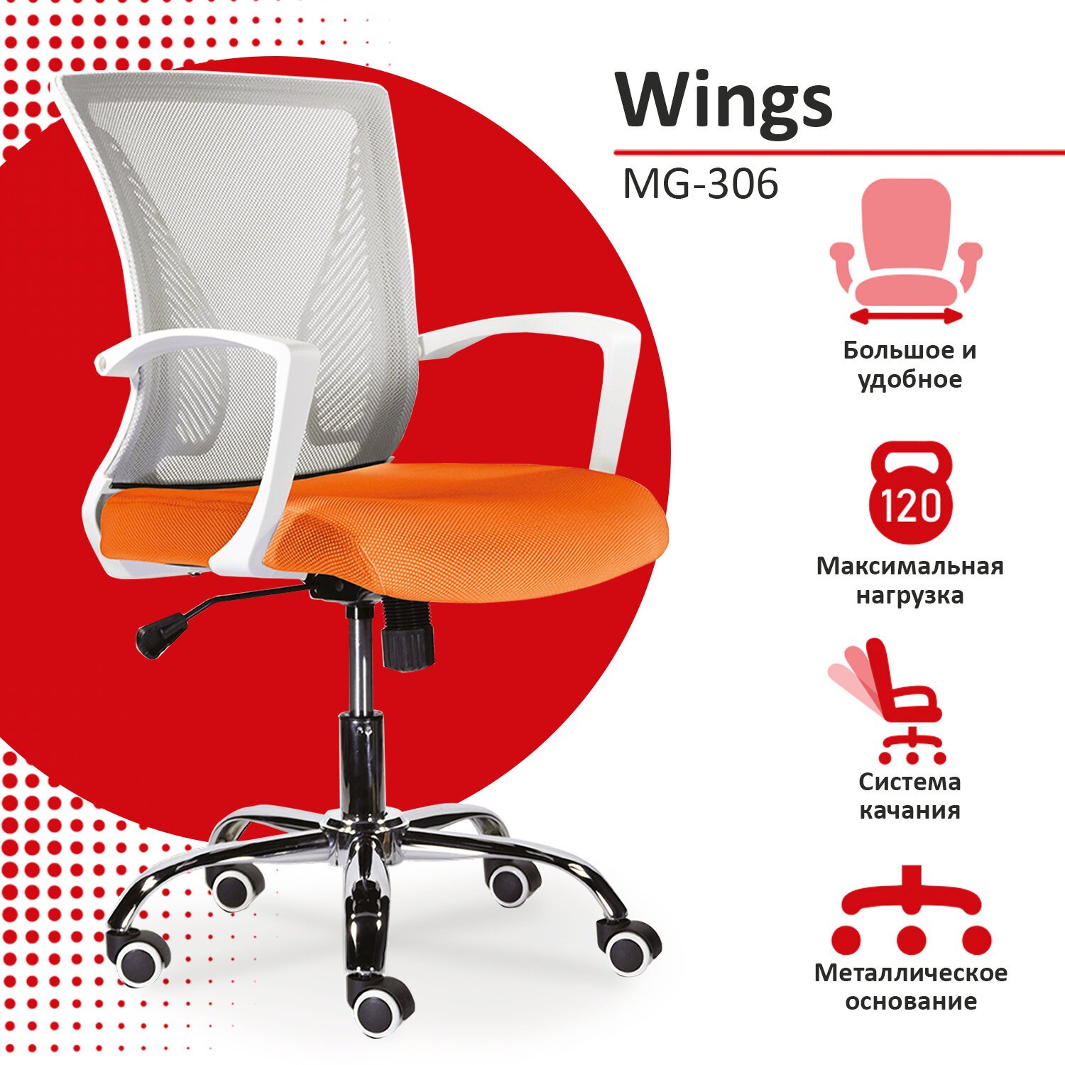 Кресло BRABIX "Wings MG-306", пластик белый, хром, сетка, серое/оранжевое, 532011