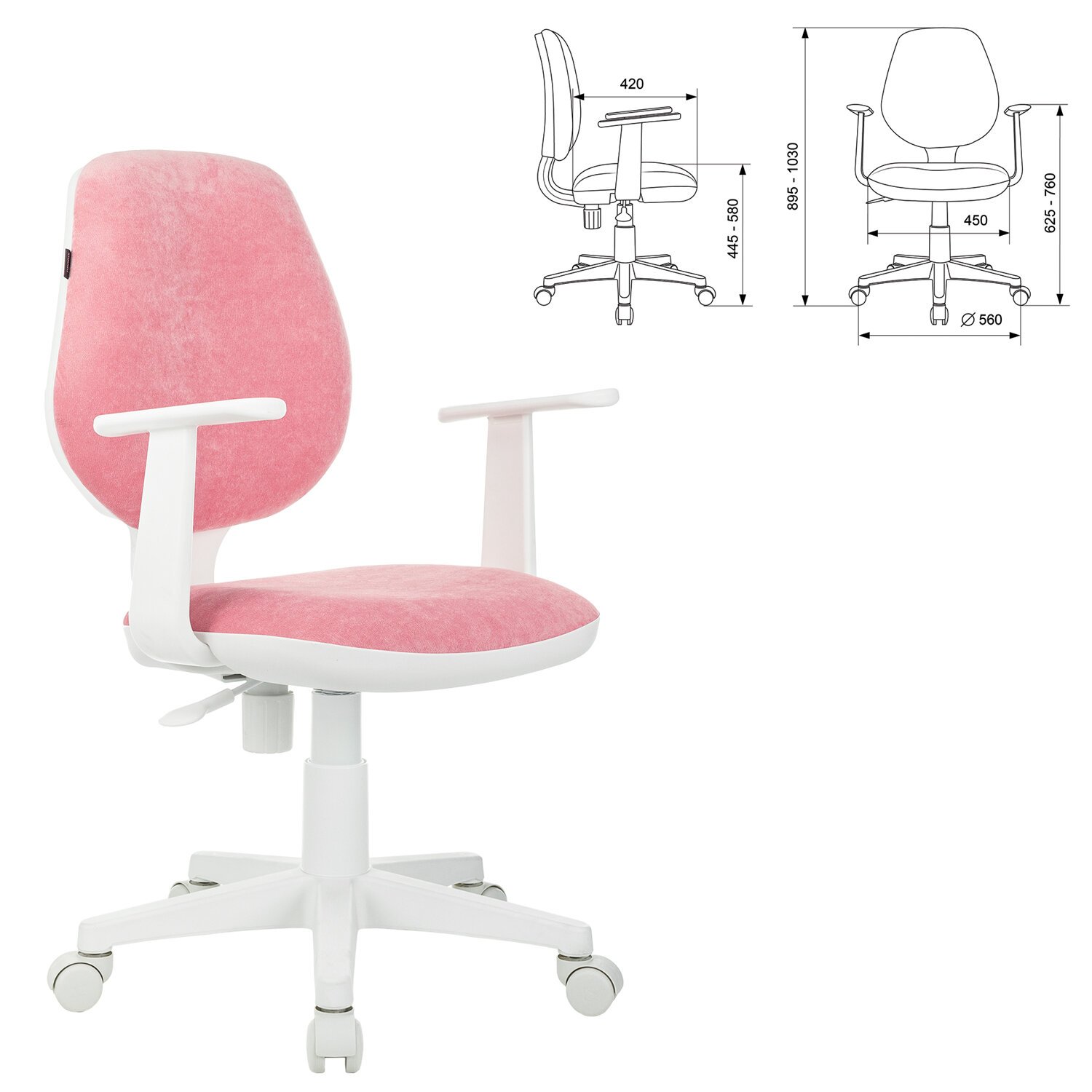 Кресло детское BRABIX "Fancy MG-201W", с подлокотниками, пластик белый, ткань вельветовая, розовое, 533009