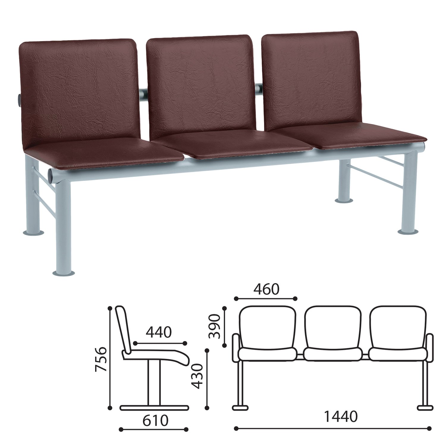 Кресло для посетителей трехсекционное "Терра", серебристый каркас, кожзам коричневый