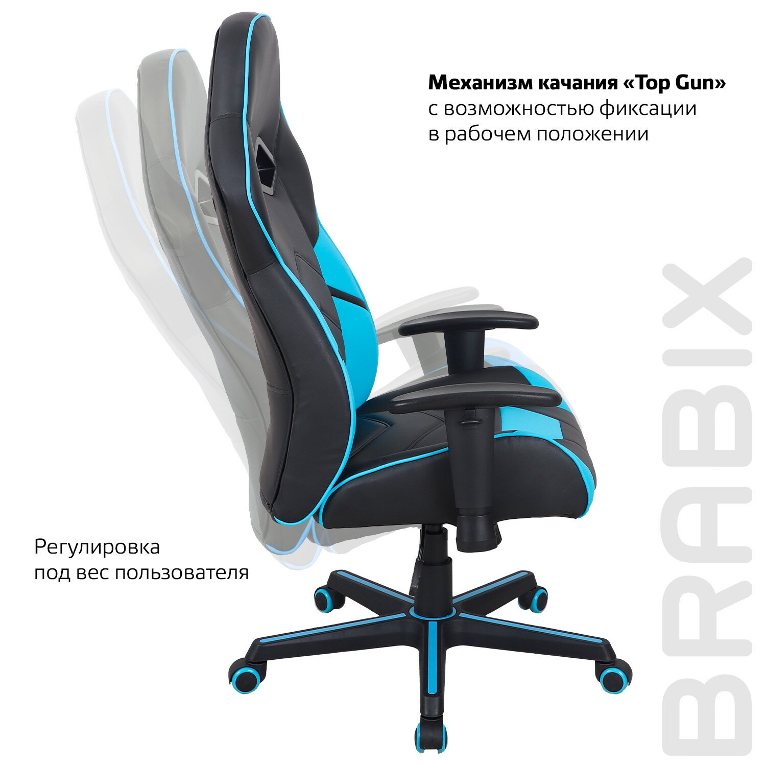Модель оснащена механизмом качания «топ-ган» с регулировкой под вес пользователя и возможностью фиксации в рабочем положении.