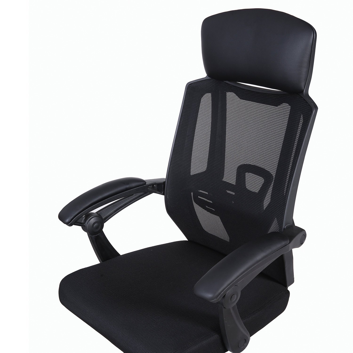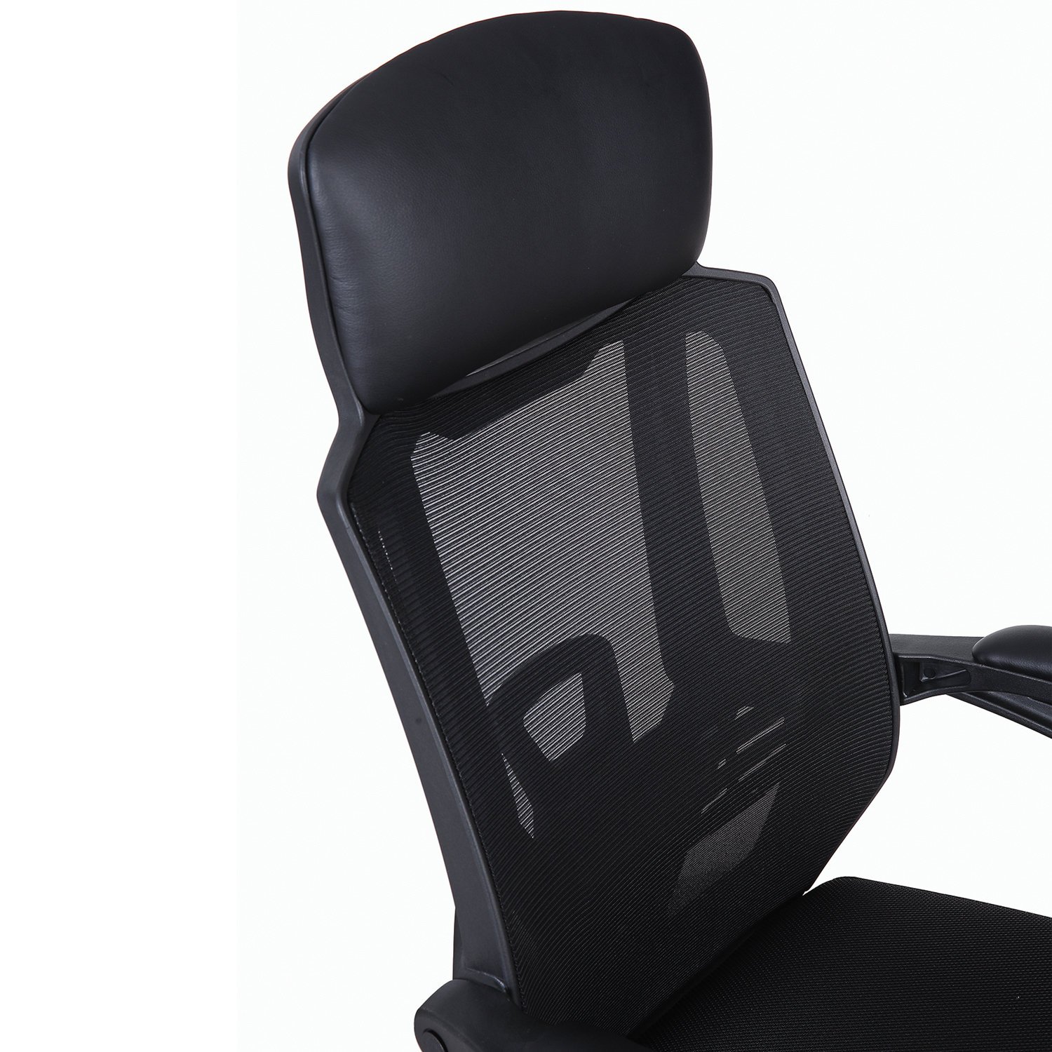 Обивка спинки выполнена из прочной сетки, высокий подголовник обит экокожей - высокотехнологичный материал из пористого полиуретана на хлопковой основе.