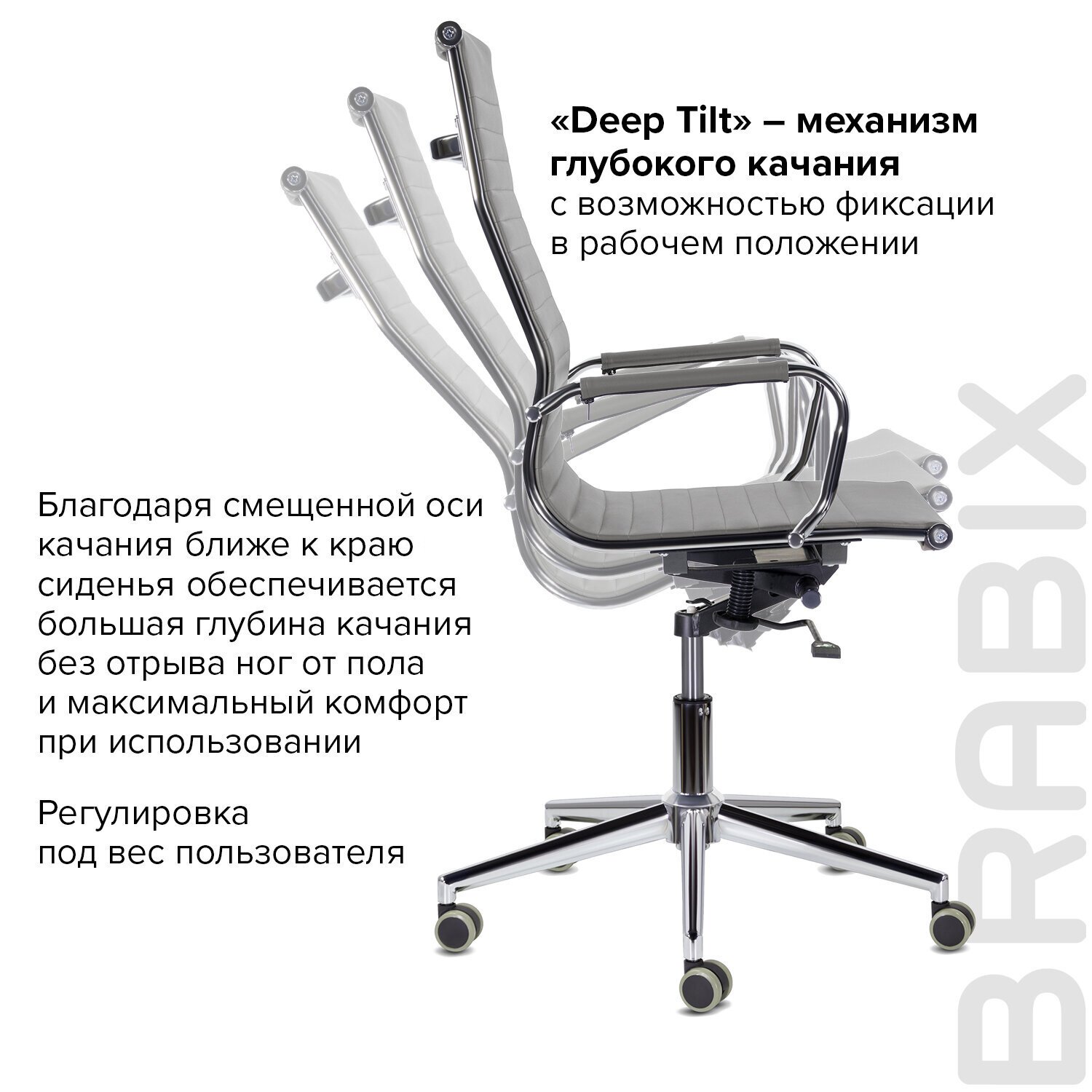 Механизм качания "Deep Tilt" - это возможность глубоко раскачиваться в кресле, а также фиксация в одном рабочем положении. А благодаря смещенной оси качания ближе к краю сиденья ноги пользователя не отрываются от пола в отличие от обычного механизма качания "Top Gun". Механизм "Deep Tilt" отличается от других своей прочностью, надежностью, а также плавностью хода.
