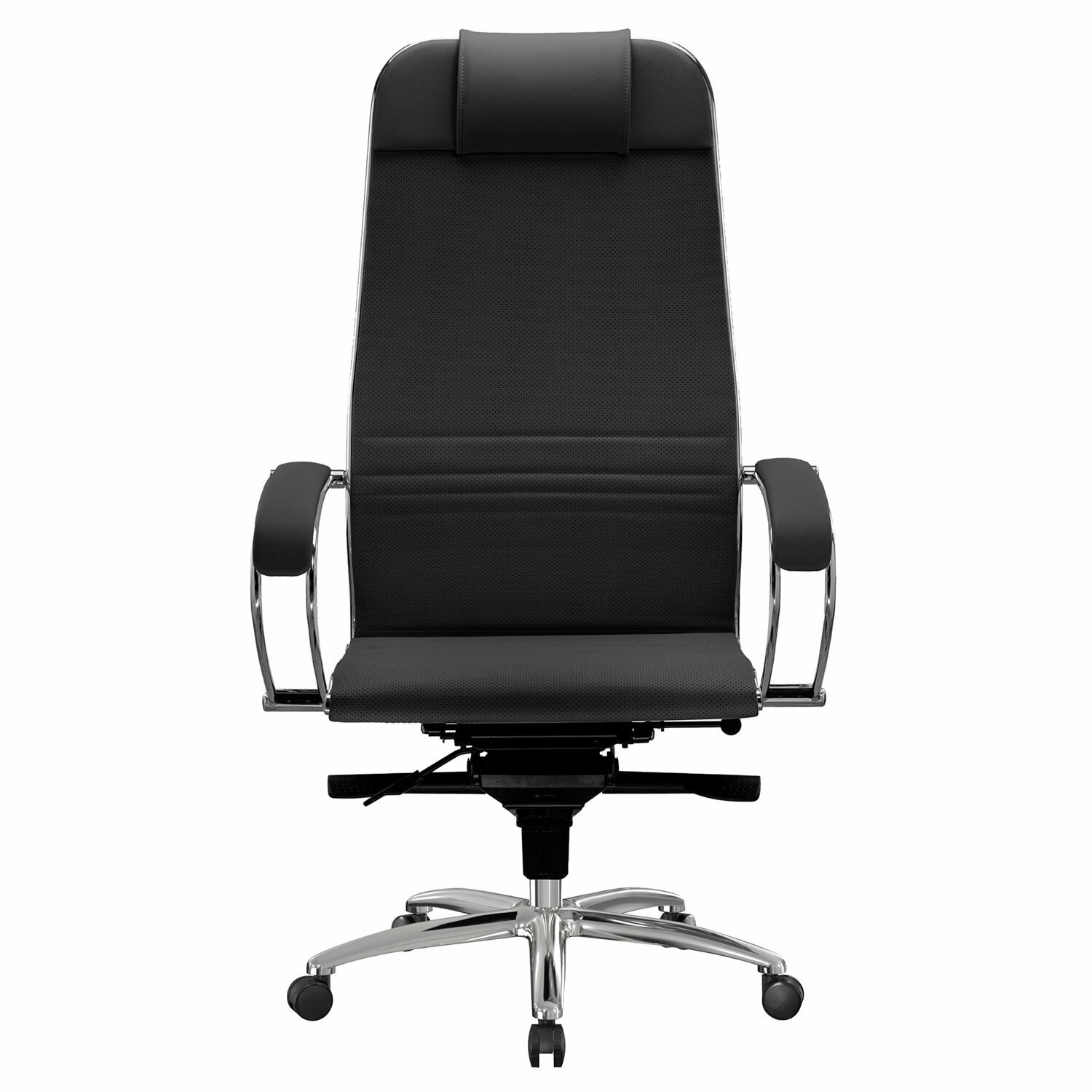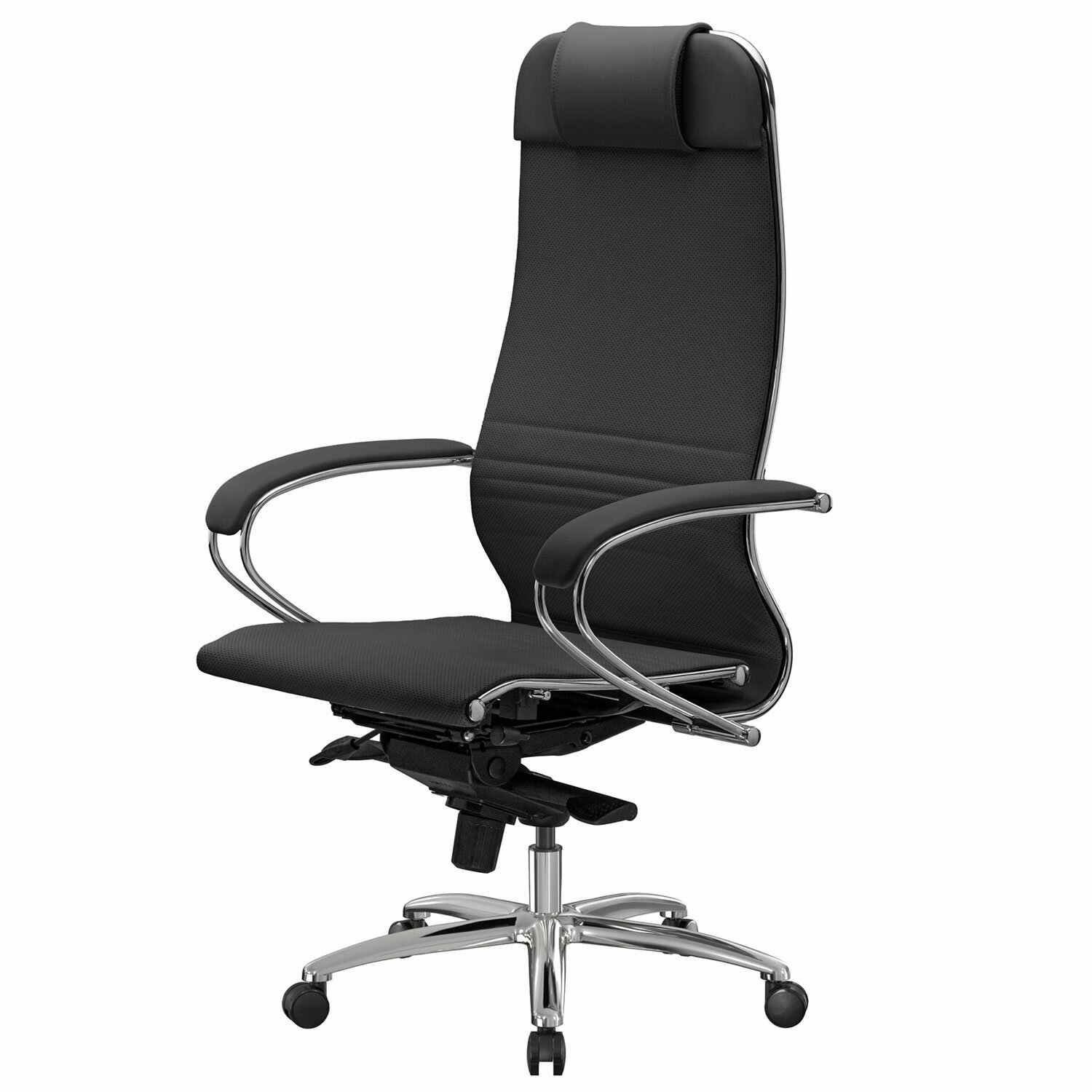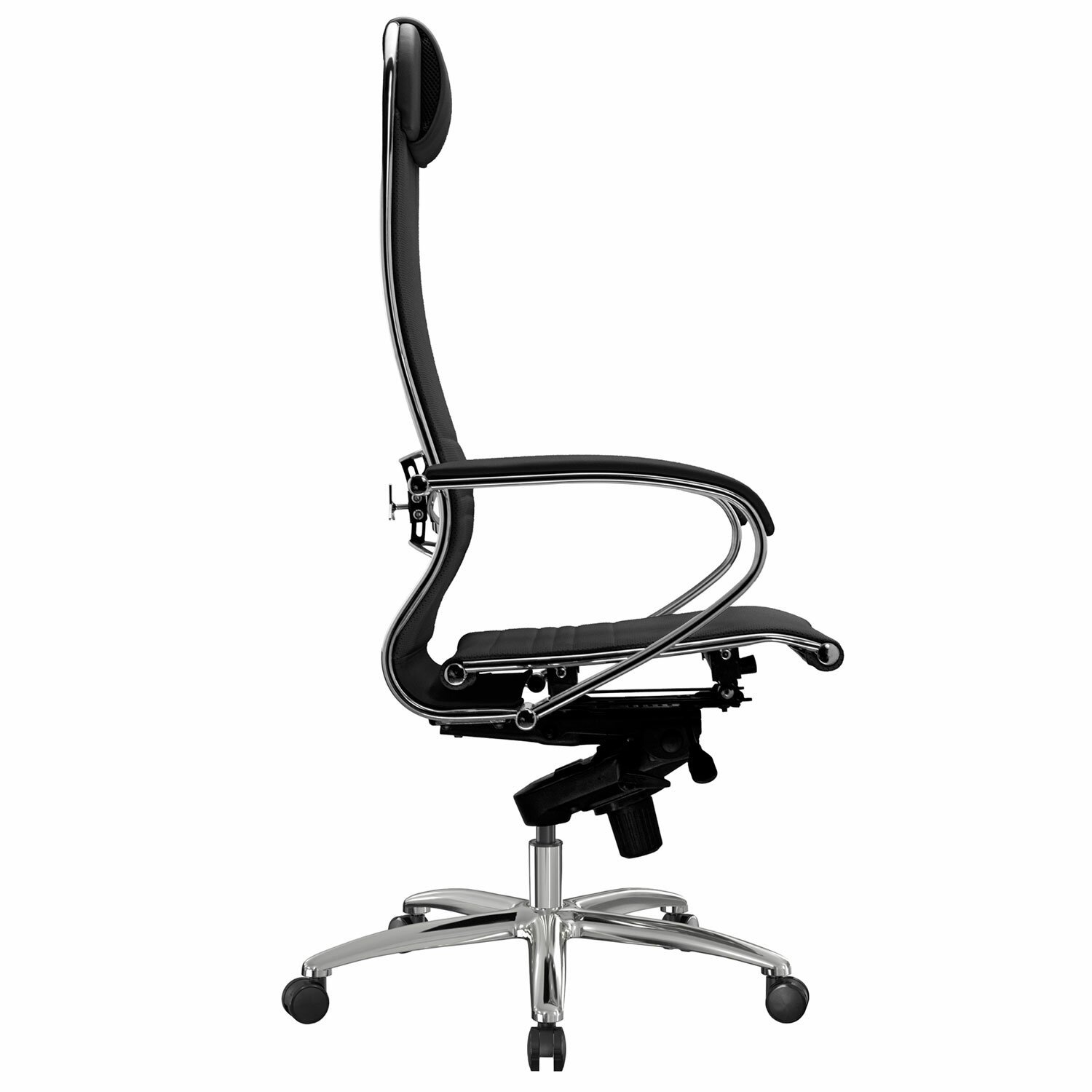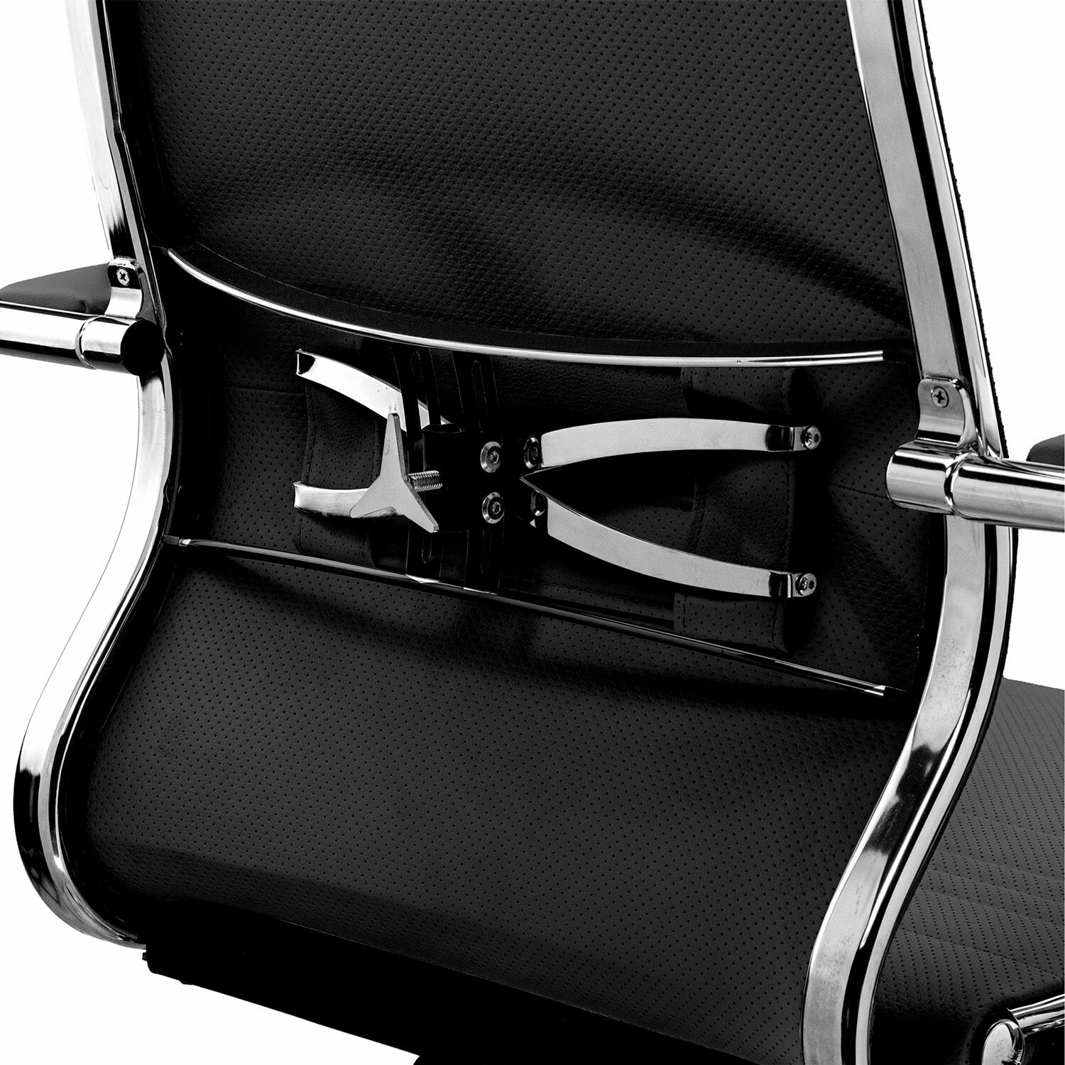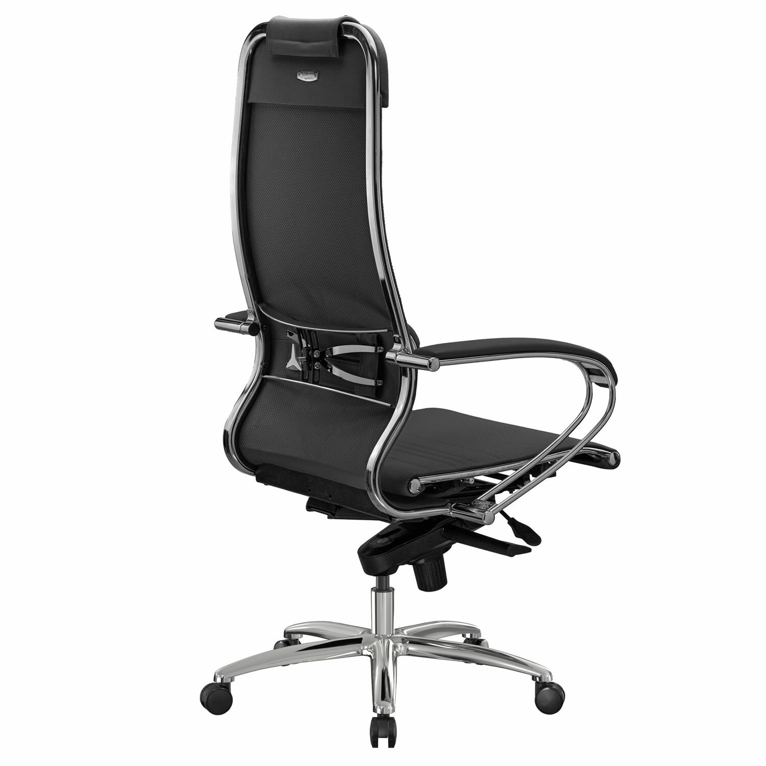 Эргономичная форма спинки соответствует анатомической форме человека. Двухзонная регулировка жесткости поясничной поддержки. Зеркальное литое пятилучие.