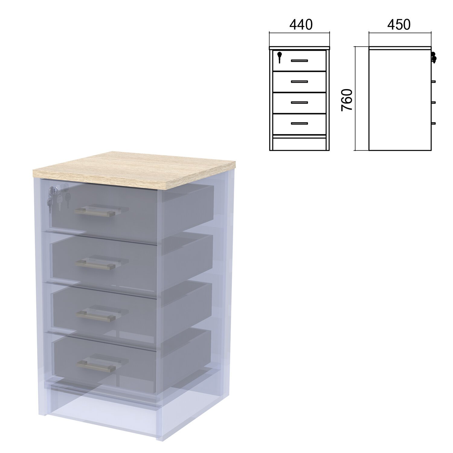 Тумба приставная "Арго", 440х450х760 мм, 4 ящика, замок, ясень шимо (КОМПЛЕКТ)