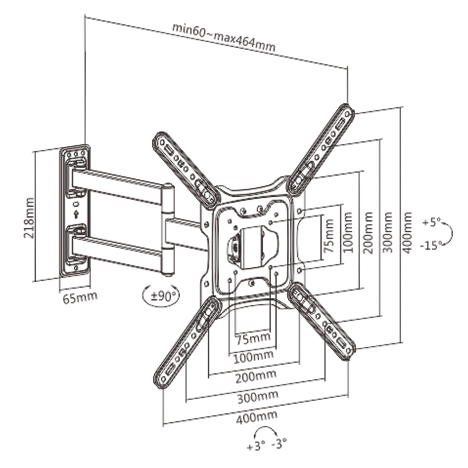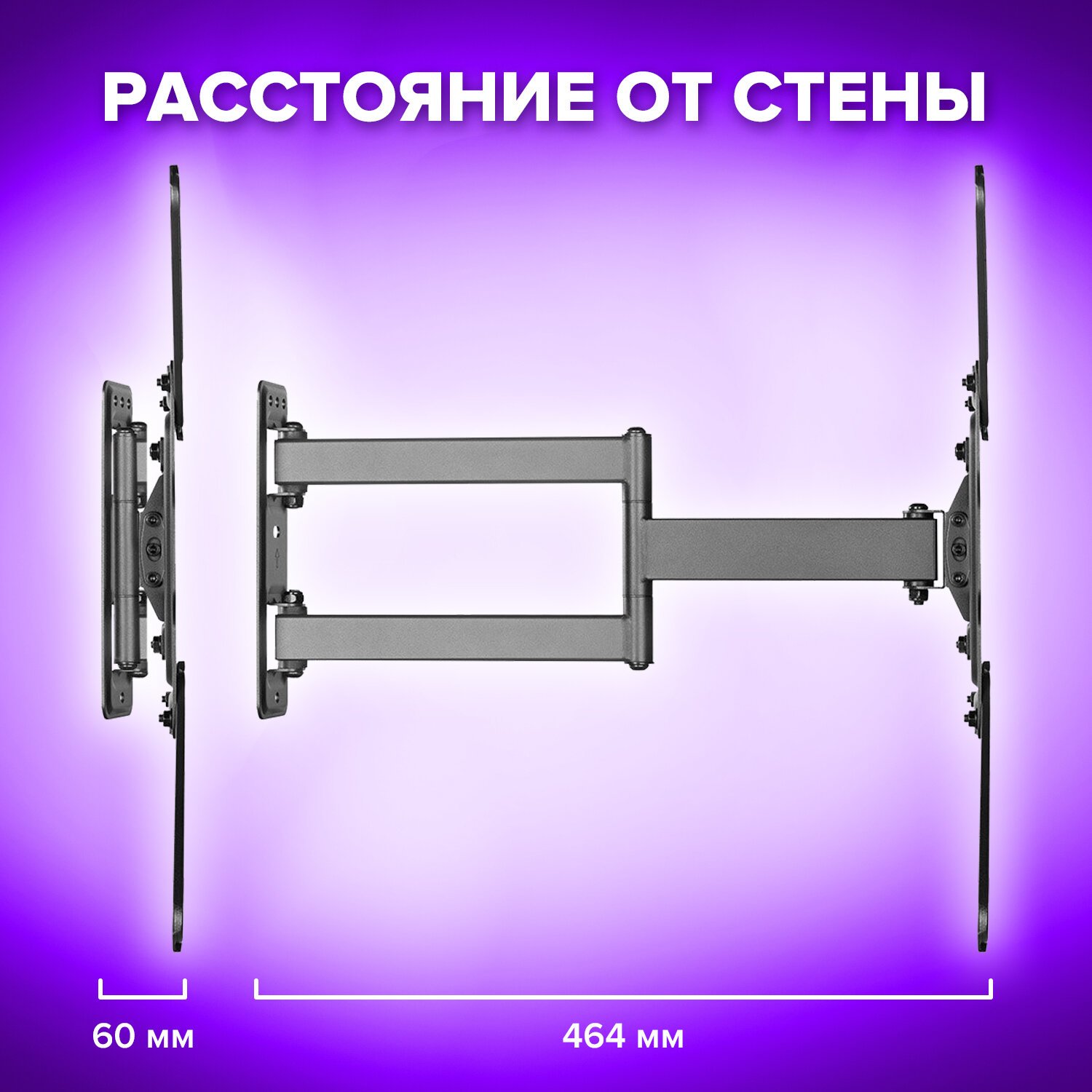 Поворотно-наклонная конструкция кронштейна обладает широкими возможностями регулировки: позволяет наклонять экран на 5° вверх и 15° вниз, поворачивать на 90° вправо и влево, выдвигать от стены на расстояние 60 - 464 мм. Все это поможет Вам подобрать оптимальный угол обзора для вашего комфорта.