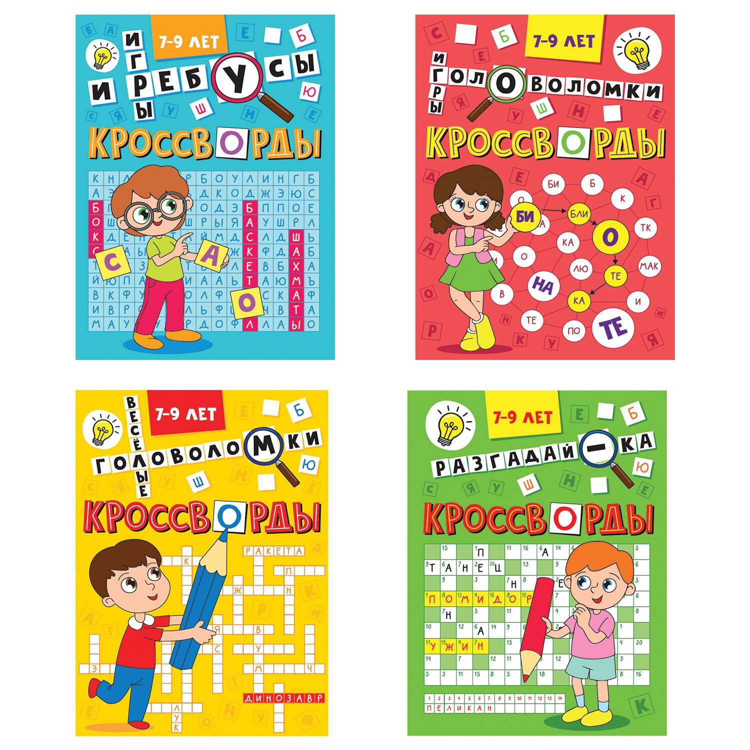 Каждое наименование включает в себя яркие иллюстрации и разнообразные виды кроссвордов: филворды, судоку, сканворды и головоломки.