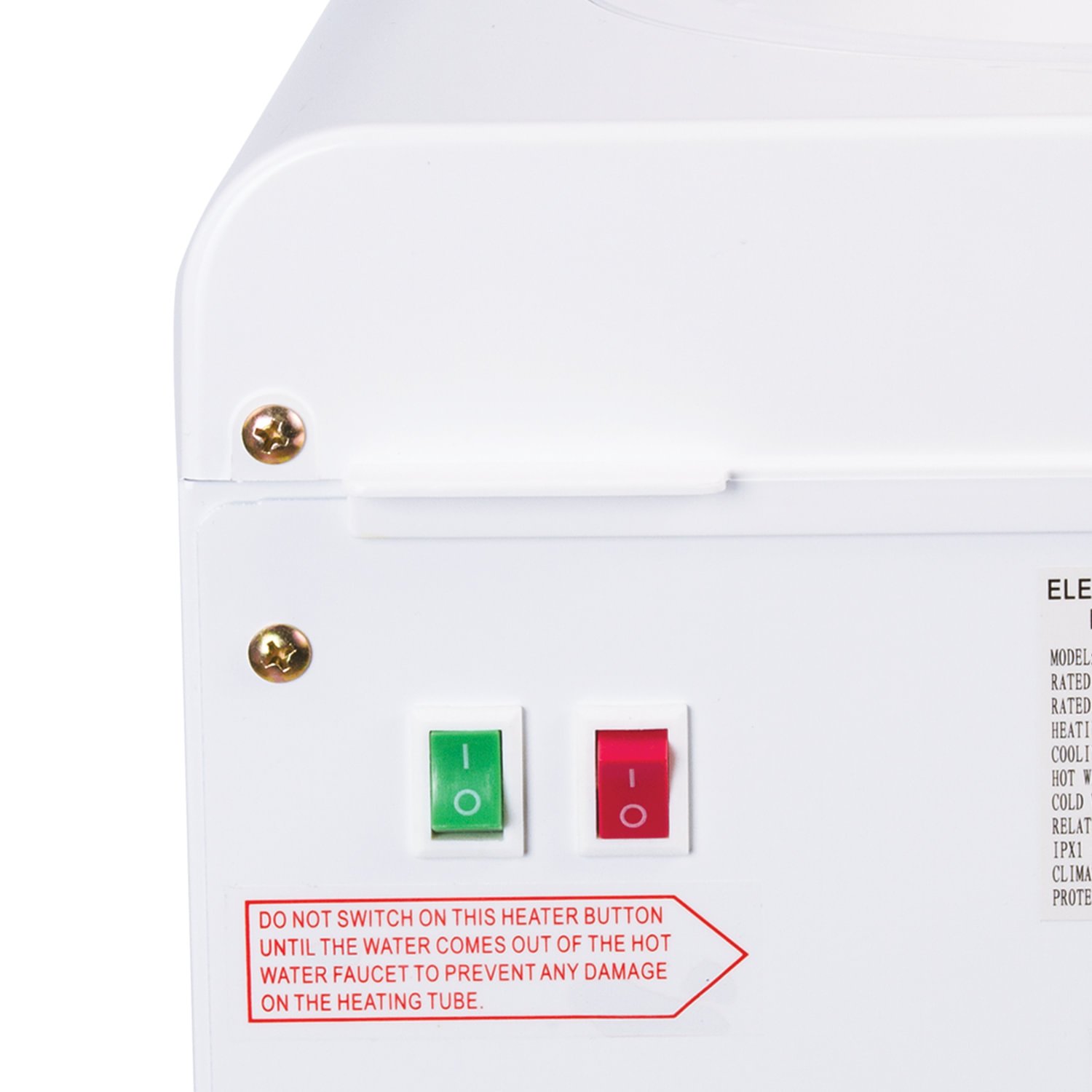 Вода нагревается с помощью ТЭНа мощностью 550 Вт, что позволяет достичь температуры 90 °С за считанные минуты. Модуль электронного охлаждения мощностью 70 Вт обеспечивает поддержание температуры холодной воды на уровне 10 °С. Кулер предназначен для напольного размещения и имеет 2 крана типа "нажим кружкой", а также защиту от протечек воды. Материал корпуса представляет собой сочетание металла и пластика. Для использования необходимо поместить бутыль в специальное отверстие в верхней части диспенсера. Перед первым использованием необходимо слить около 1 л воды, чтобы очистить накопительный бак и трубки от скопившейся производственной пыли. Для нагревания требуется в разы меньше электроэнергии, чем для нагревания самого обычного электрического чайника. Благодаря тому, что высокая температура воды в кулере поддерживается постоянно, больше не нужно будет ждать, пока он нагреется, что особенно важно для крупных компаний с большим количеством сотрудников и посетителей.