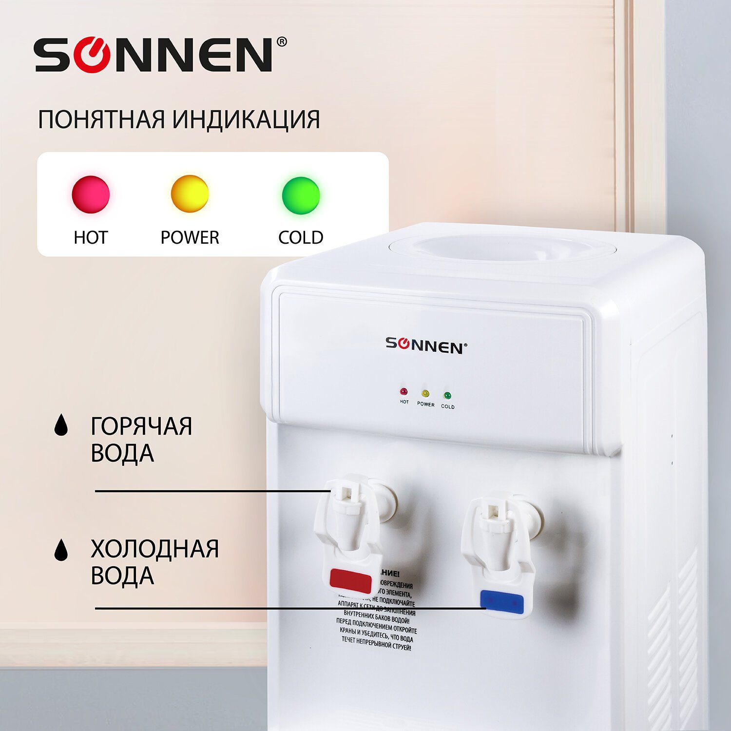 Кулер для воды SONNEN FS-01, напольный, НАГРЕВ/ОХЛАЖДЕНИЕ ЭЛЕКТРОННОЕ, 2 крана, белый, 452419