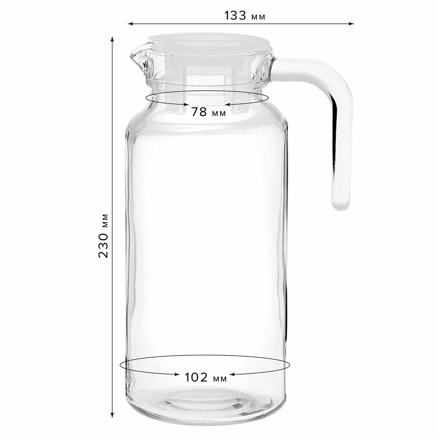 Высота графина – 23 см. Диаметр горлышка (верхний край) – 78 мм, диаметр кувшина – 102 мм. Материал крышки – пластик. Подходит для мытья в посудомоечной машине.