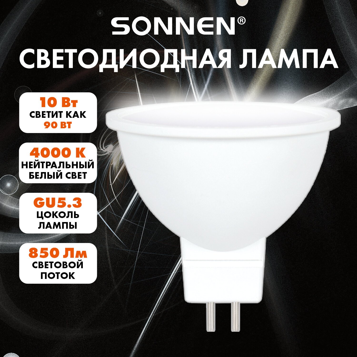 Лампа светодиодная SONNEN EXTRA, 10 (90) Вт, GU5.3, нейтральный белый, 30000 ч, LED MR16-GU5.3-10W-4000, 457919