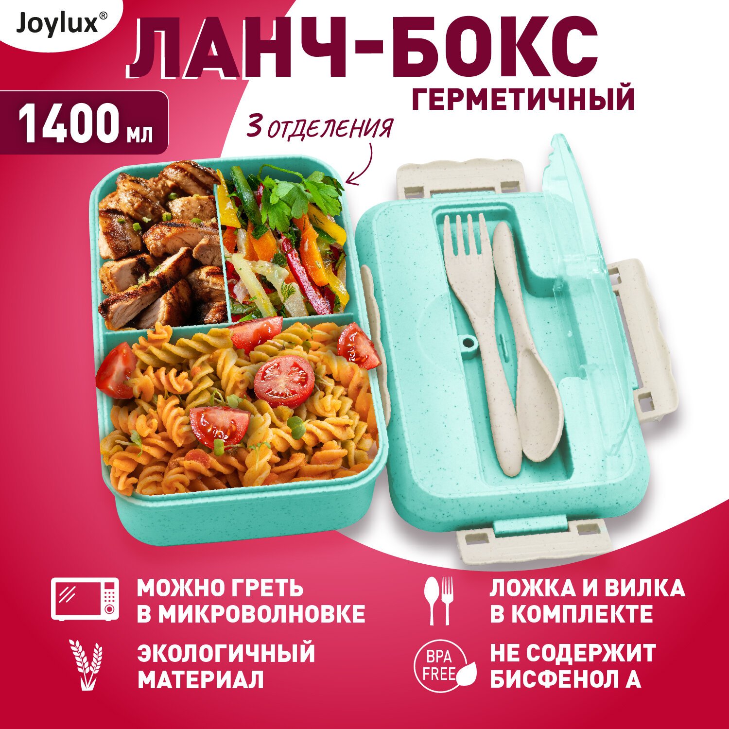 Многофункциональный герметичный ланч-бокс Joylux объемом 1400 мл имеет три отсека и изготовлен из пластика высокого качества – это универсальное и безопасное решение для полноценного сбалансированного приема пищи в офисе, школе, поездках и путешествиях!