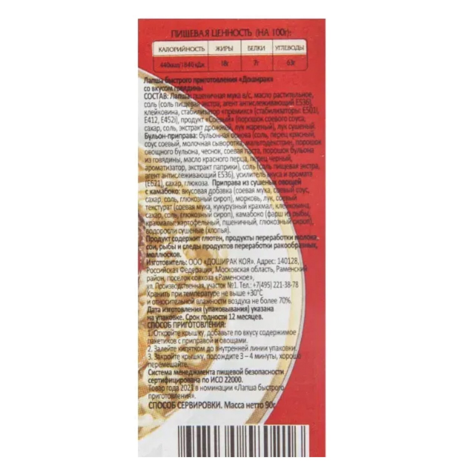 Лапша ДОШИРАК со вкусом говядины – это индивидуальная порция скрученной лапши из высококачественной пшеничной муки в контейнере-подложке, который удобно использовать для заваривания.