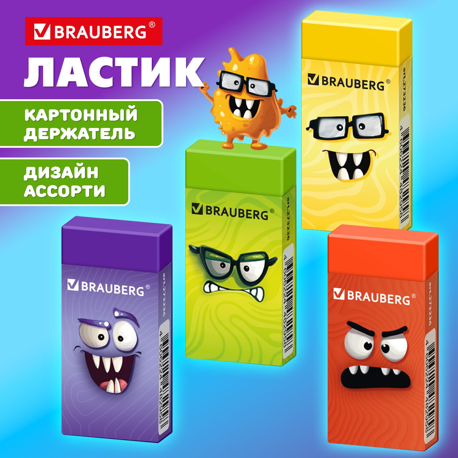 Ластик BRAUBERG CUTE MONSTERS, 50х24х10 мм, прямоугольный, цвета ластика ассорти, эко-пвх, картонный держатель, 273236