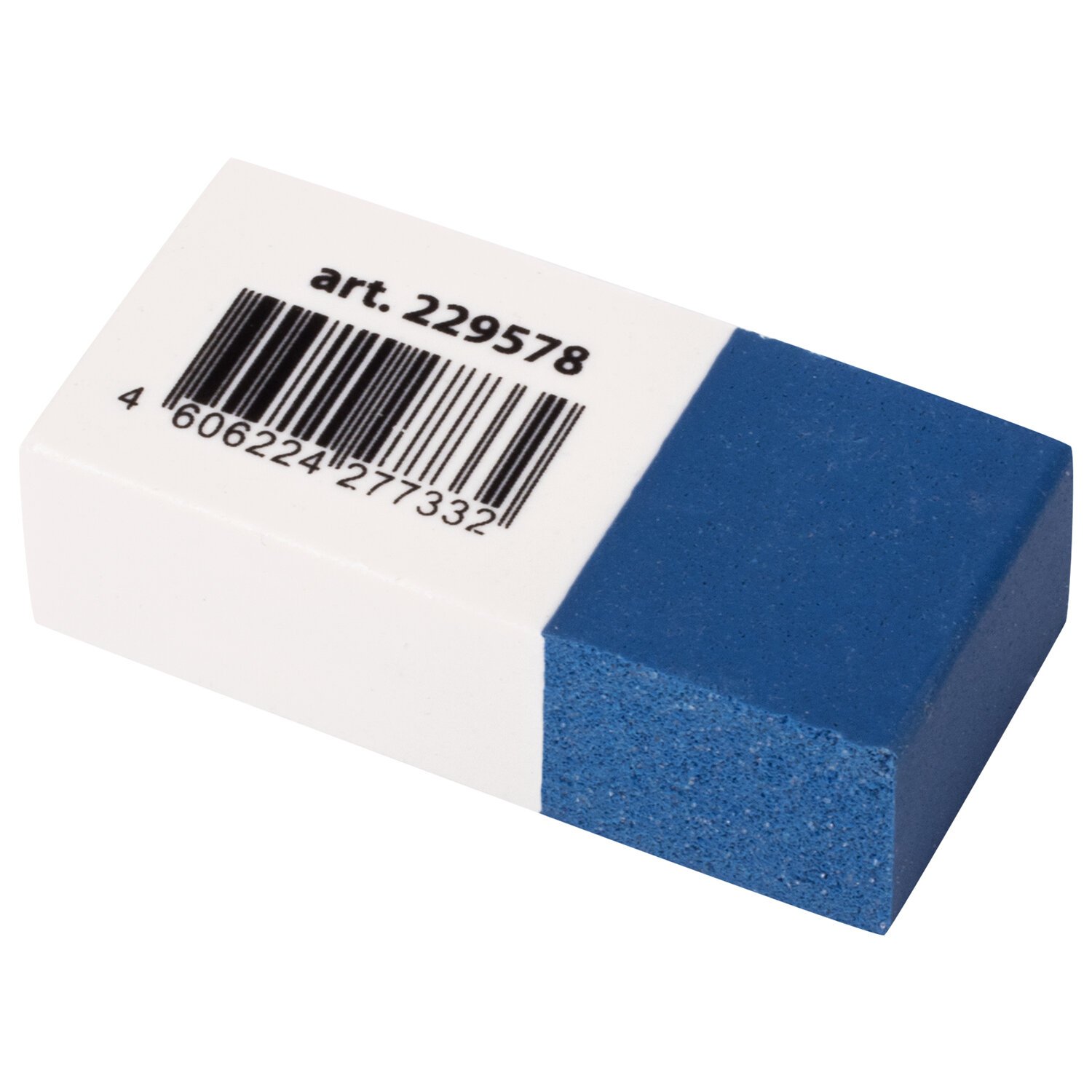 Высококачественный ластик изготовлен из термопластичной резины. Поставляется в сине-белом цвете и имеет прямоугольную форму с разделением на две части: белая - предназначена для стирания надписей, сделанных чернографитным карандашом, синяя, с повышенным содержанием абразивных частиц, предназначена для стирания надписей, сделанных чернилами. Размер - 39х18х12 мм. Поставляется в картонном дисплее.