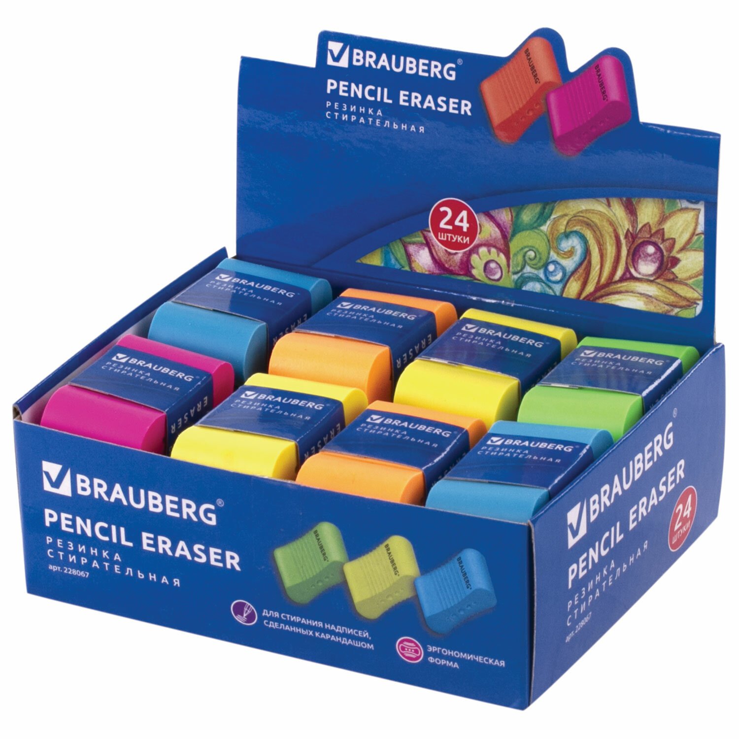 Предназначен для удаления надписей и рисунков, сделанных чернографитным карандашом. Ластик имеет удобную эргономичную форму, выполнен в ярких неоновых цветах ассорти (без возможности выбора). Поставляется в картонном держателе, препятствующем загрязнению ластика и обеспечивающим комфортное использование. Размер ластика - 42х23х13 мм.