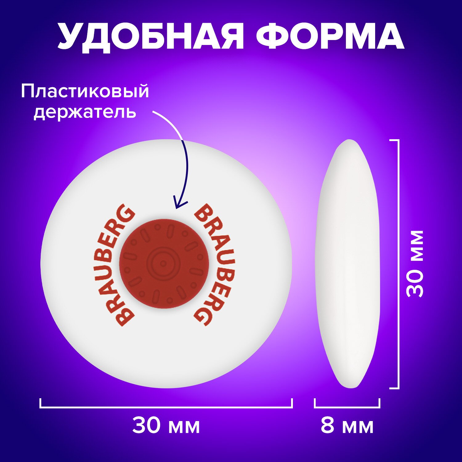 Ластик BRAUBERG "Universal", 30х30х8 мм, белый, круглый, красный пластиковый держатель, 222472