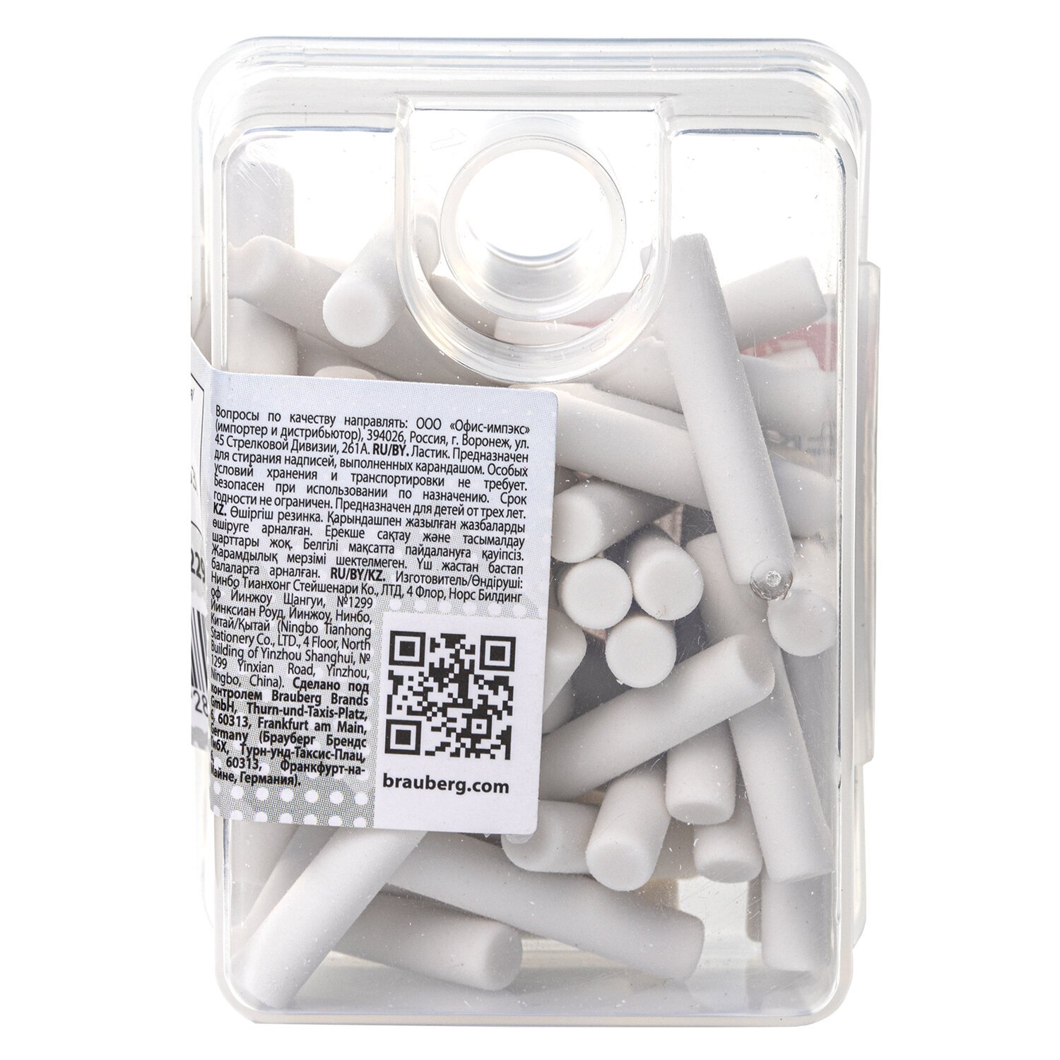 Выполнен из термопластичной резины белого цвета и имеет цилиндрическую форму. Размер сменного ластика 5х25мм. Набор состоит из 50 ластиков, поставляются в ПВХ-пенале с подвесом.
