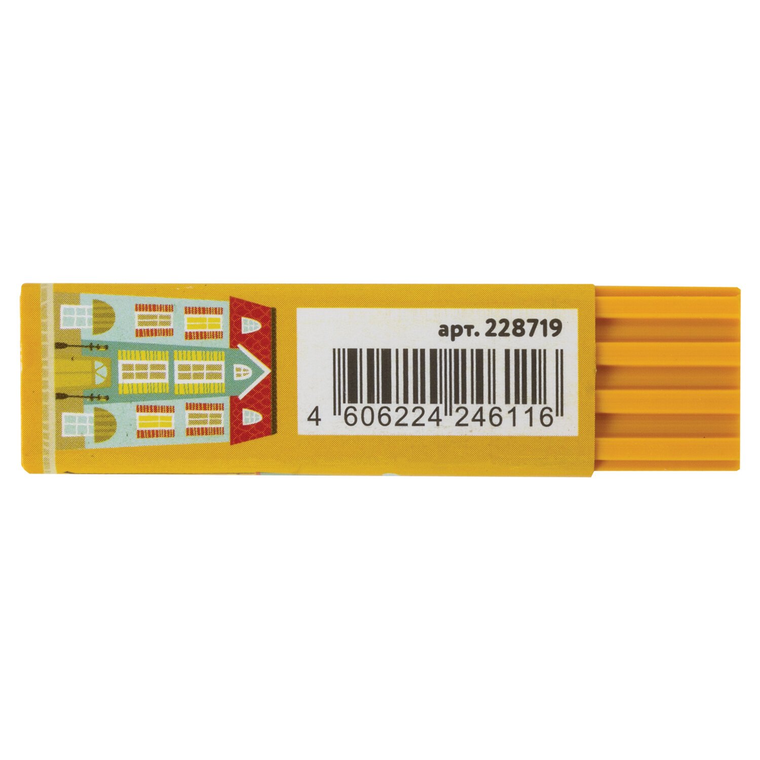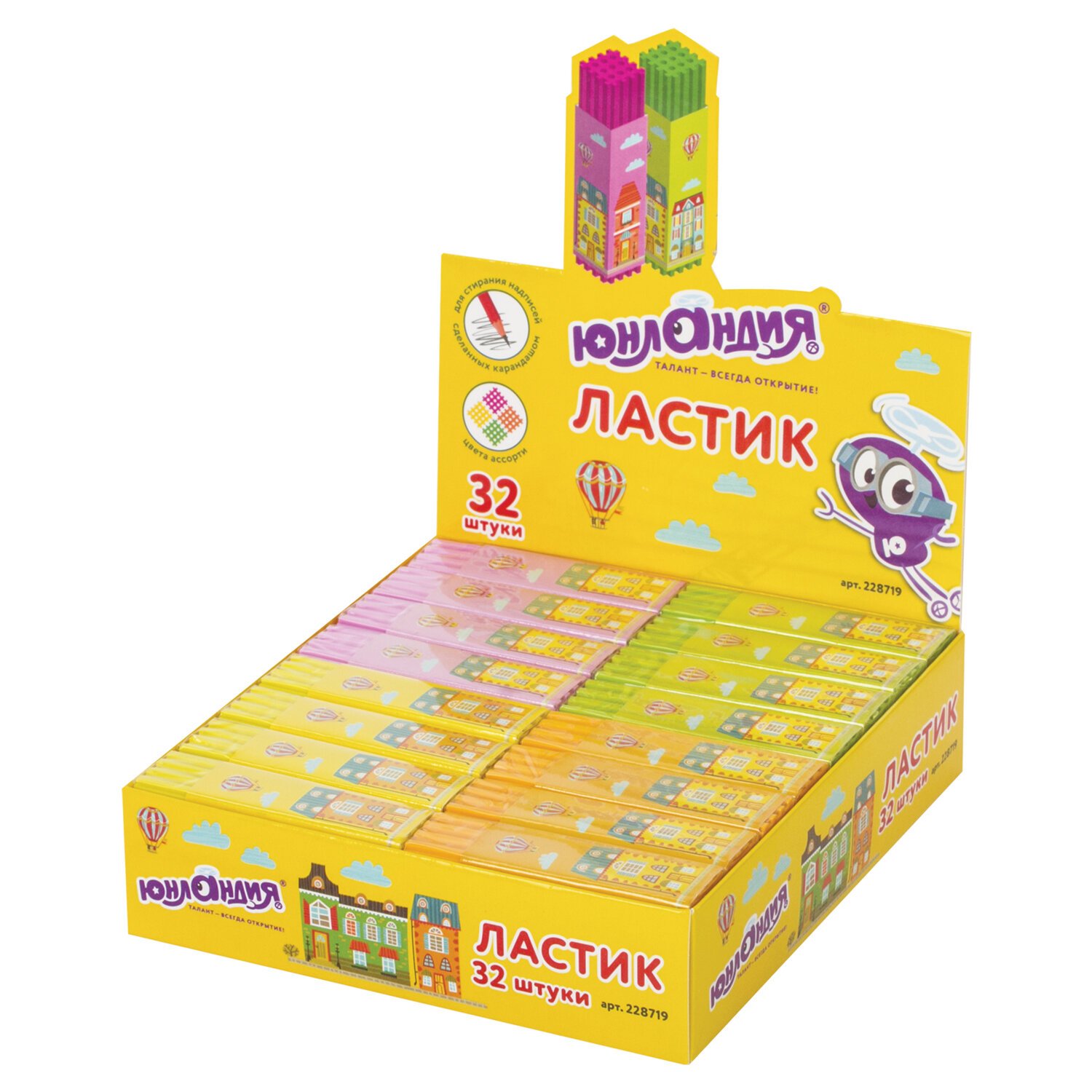 Ластик ЮНЛАНДИЯ "Башенки", 64х15х15 мм, цвет ассорти, картонный держатель, 228719