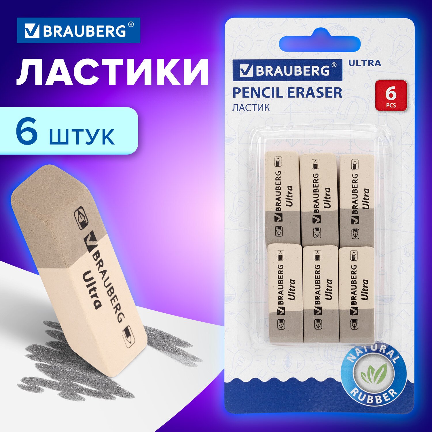 Ластики BRAUBERG "Ultra" 6 шт., размер ластика 41х14х8 мм, серо-белые, натуральный каучук, 229600