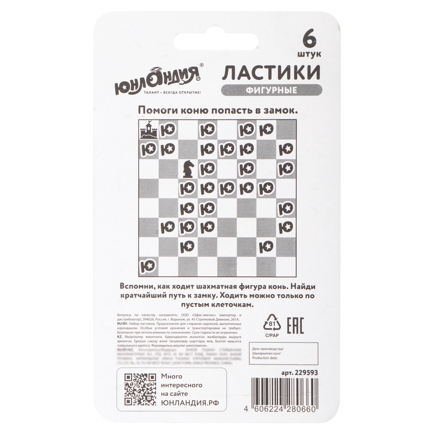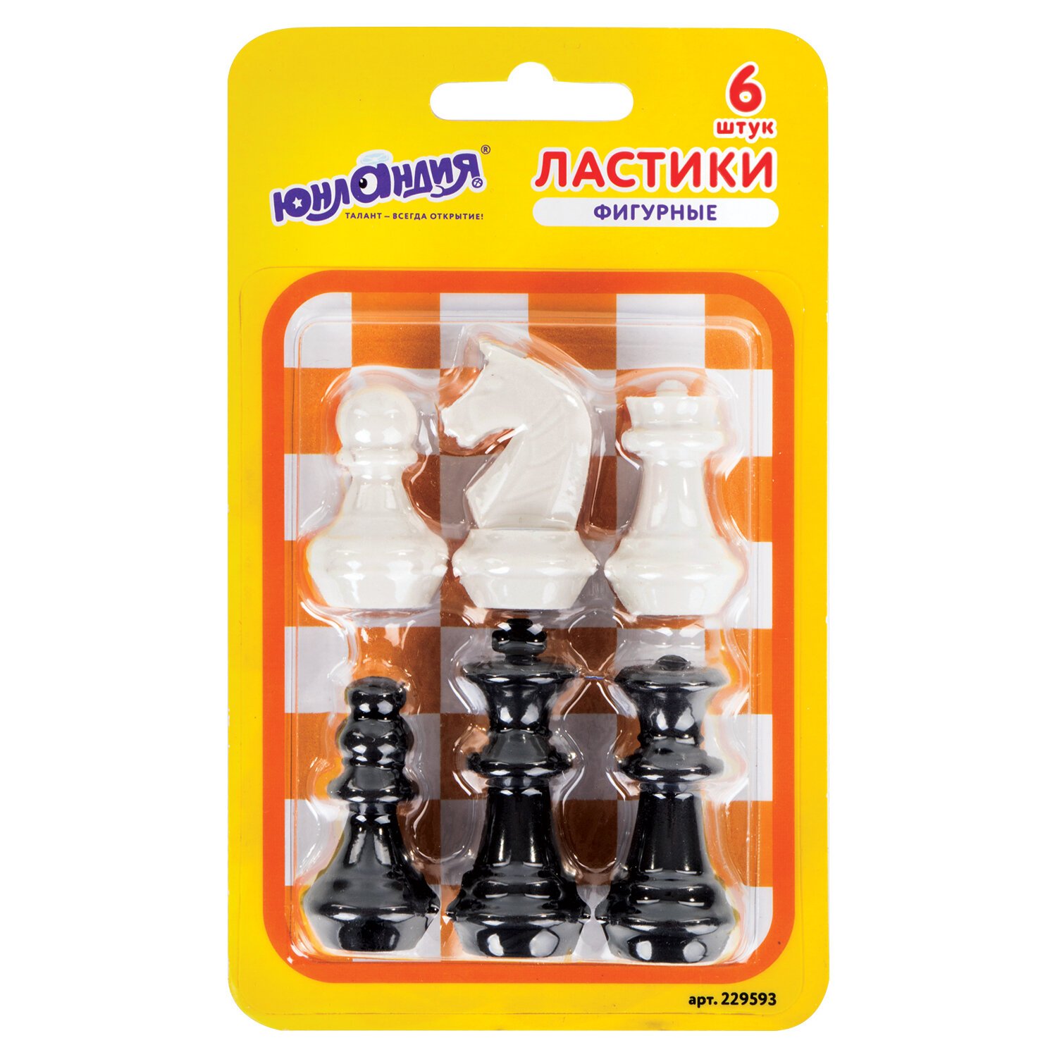 Ластики фигурные ЮНЛАНДИЯ "Шахматы" НАБОР 6 шт., черно-белые, 229593.