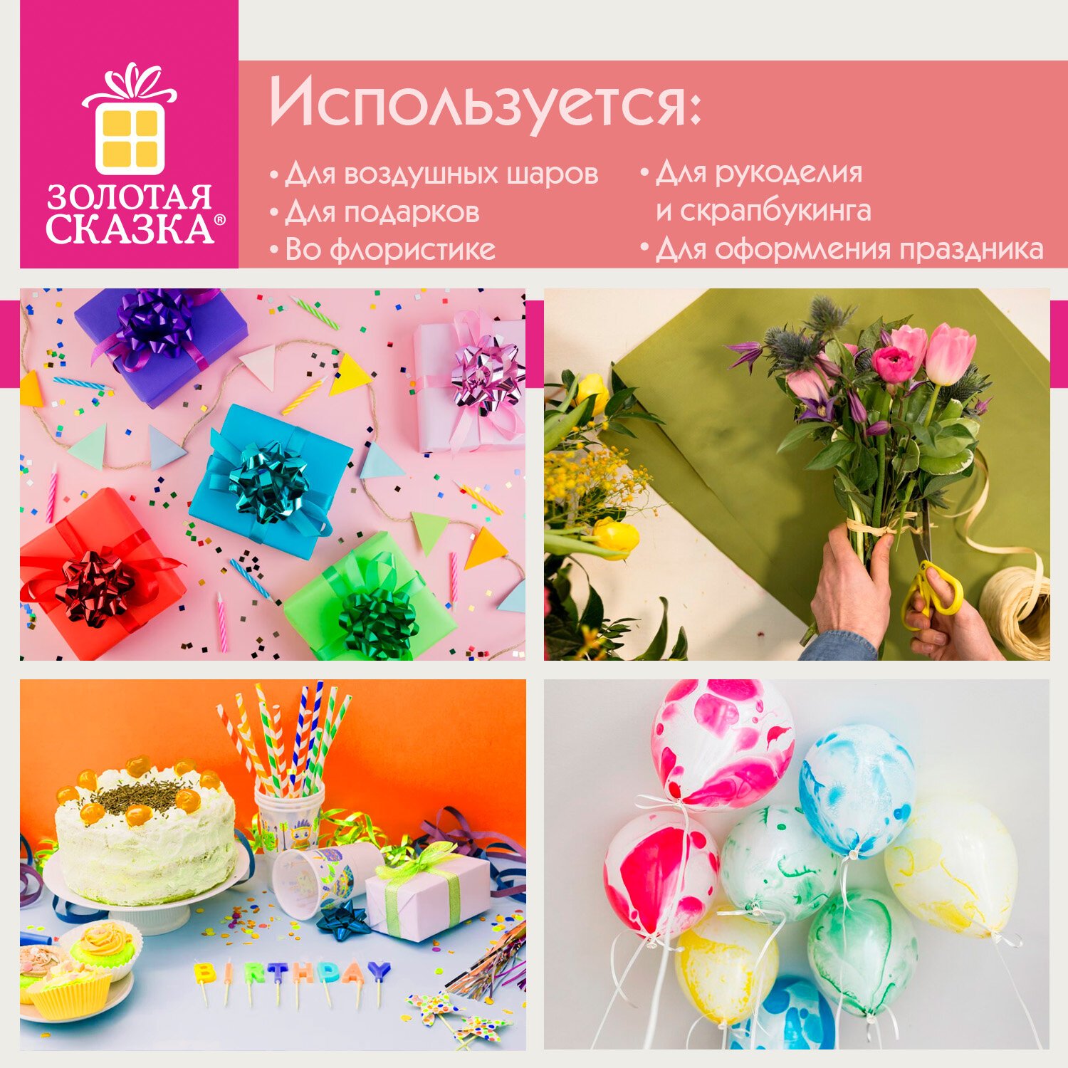 Лента упаковочная декоративная ЗОЛОТАЯ СКАЗКА предназначена для завязывания воздушных шаров и гирлянд, для декорирования подарков, для оформления праздничных композиций, кондитерских наборов. Лента также широко используется во флористике и в рукоделии.