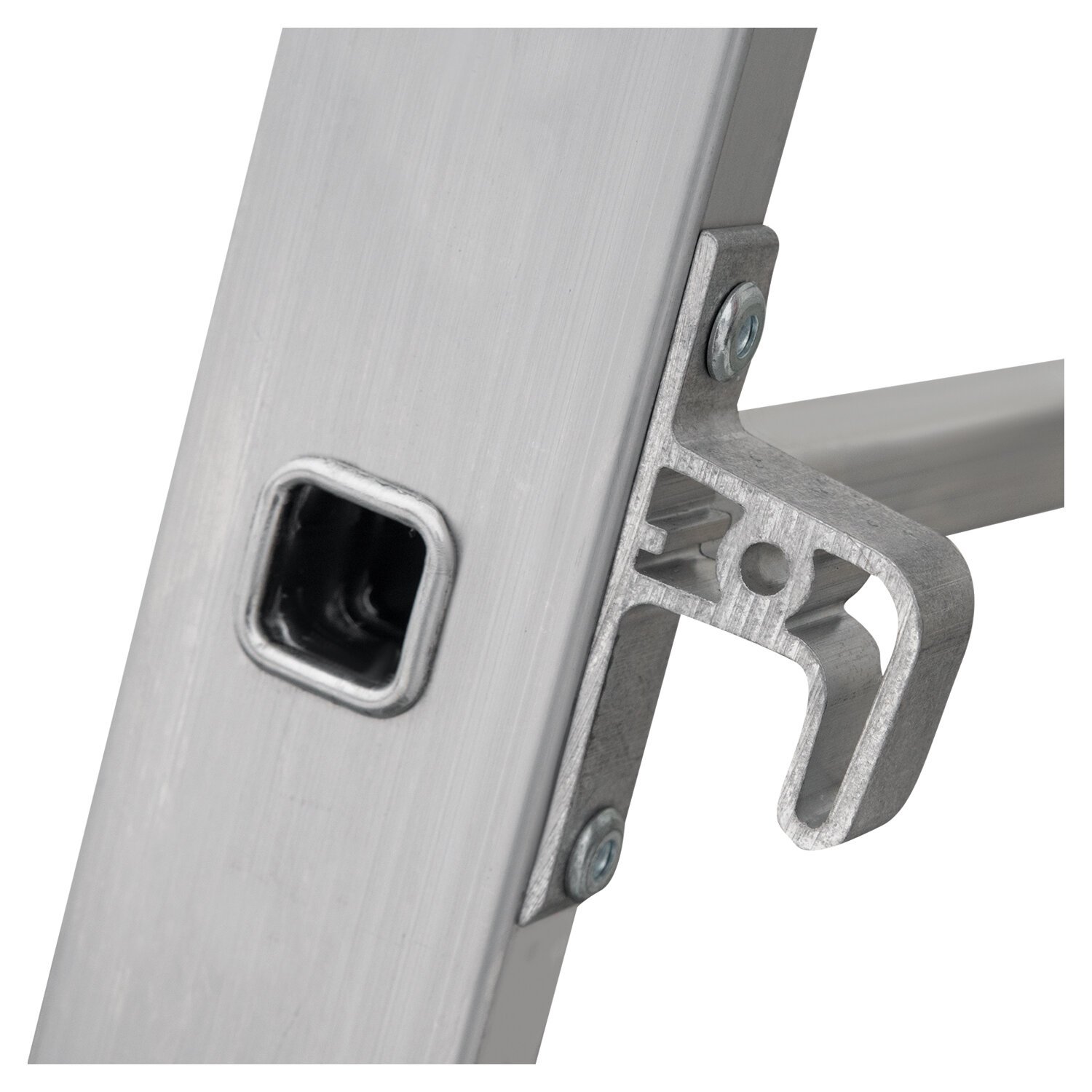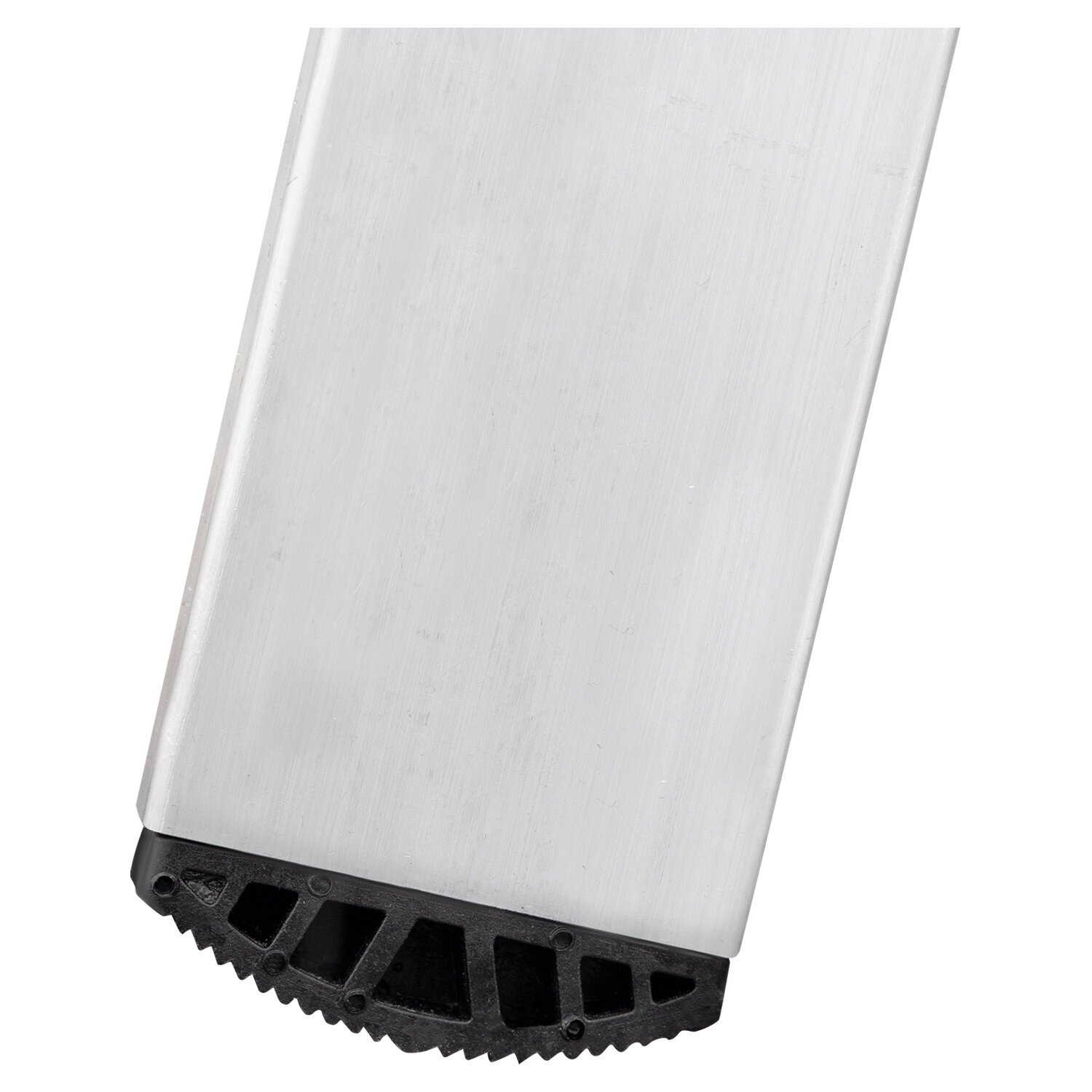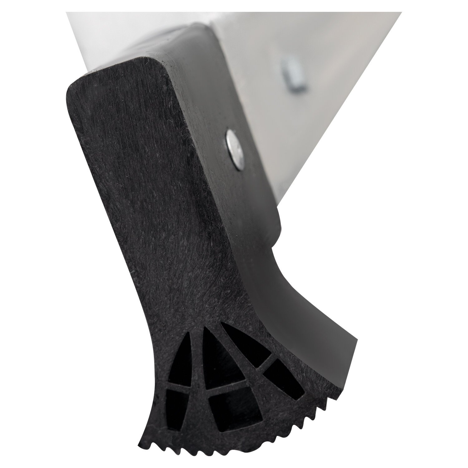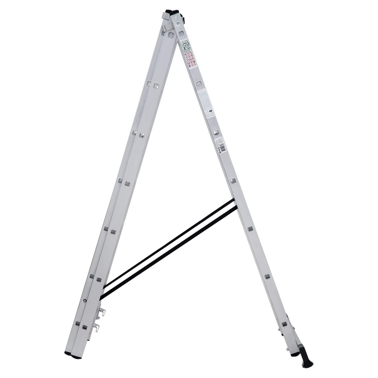 Широкая поперечная траверса обеспечивает высокую устойчивость, а надёжно закреплённые на стойках и траверсе пластиковые наконечники препятствуют скольжению. Верхняя секция легко вынимается и устанавливается и может служить отдельной приставной лестницей.