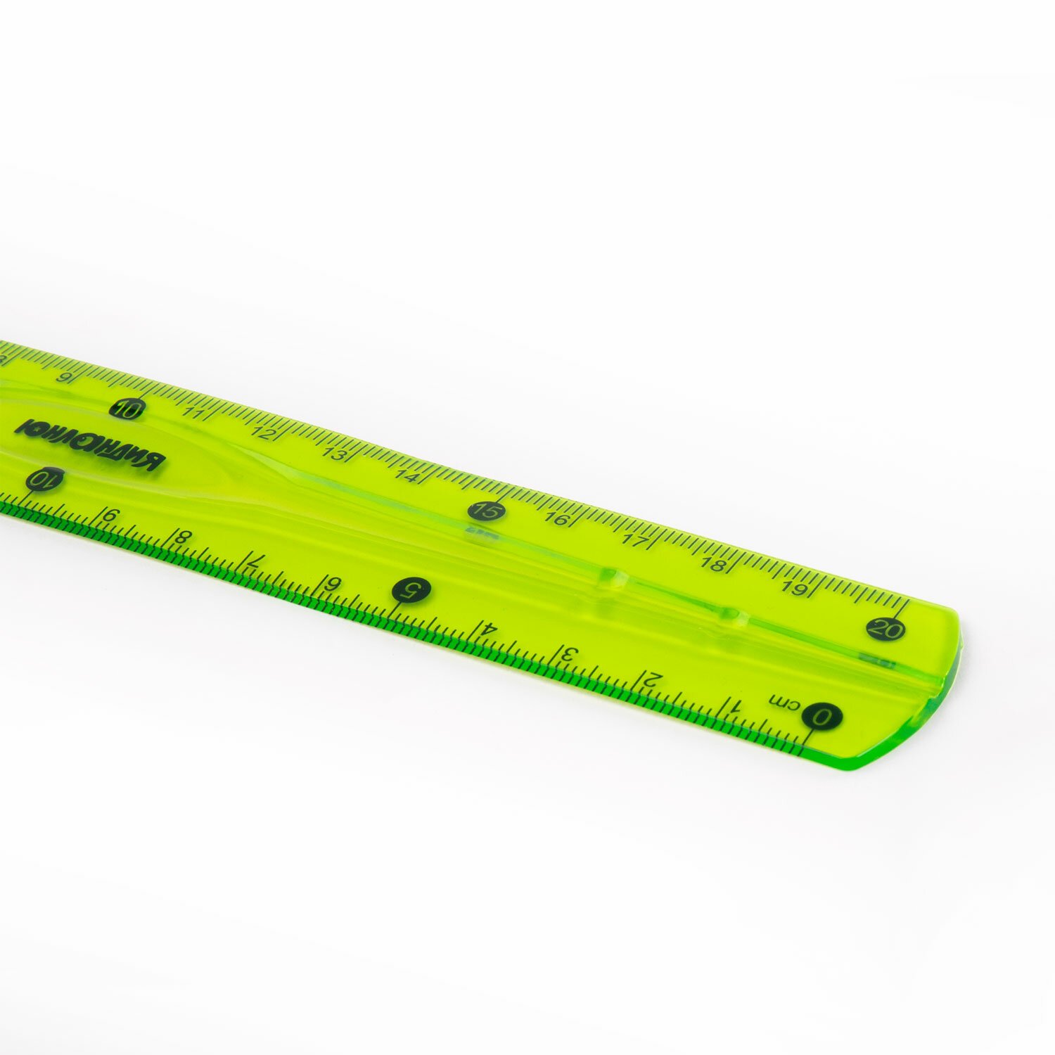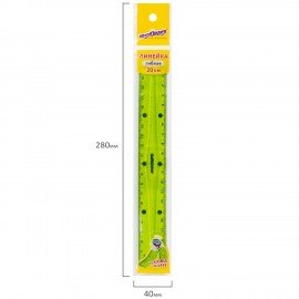 Изготовлена из гибкого прозрачного тонированного пластика зеленого цвета. Линейка имеет двустороннюю сантиметровую шкалу и четкую разметку, что делает ее удобной в использовании. Длина шкалы составляет 20 см. Упакована в пластиковый пакет с европодвесом.
