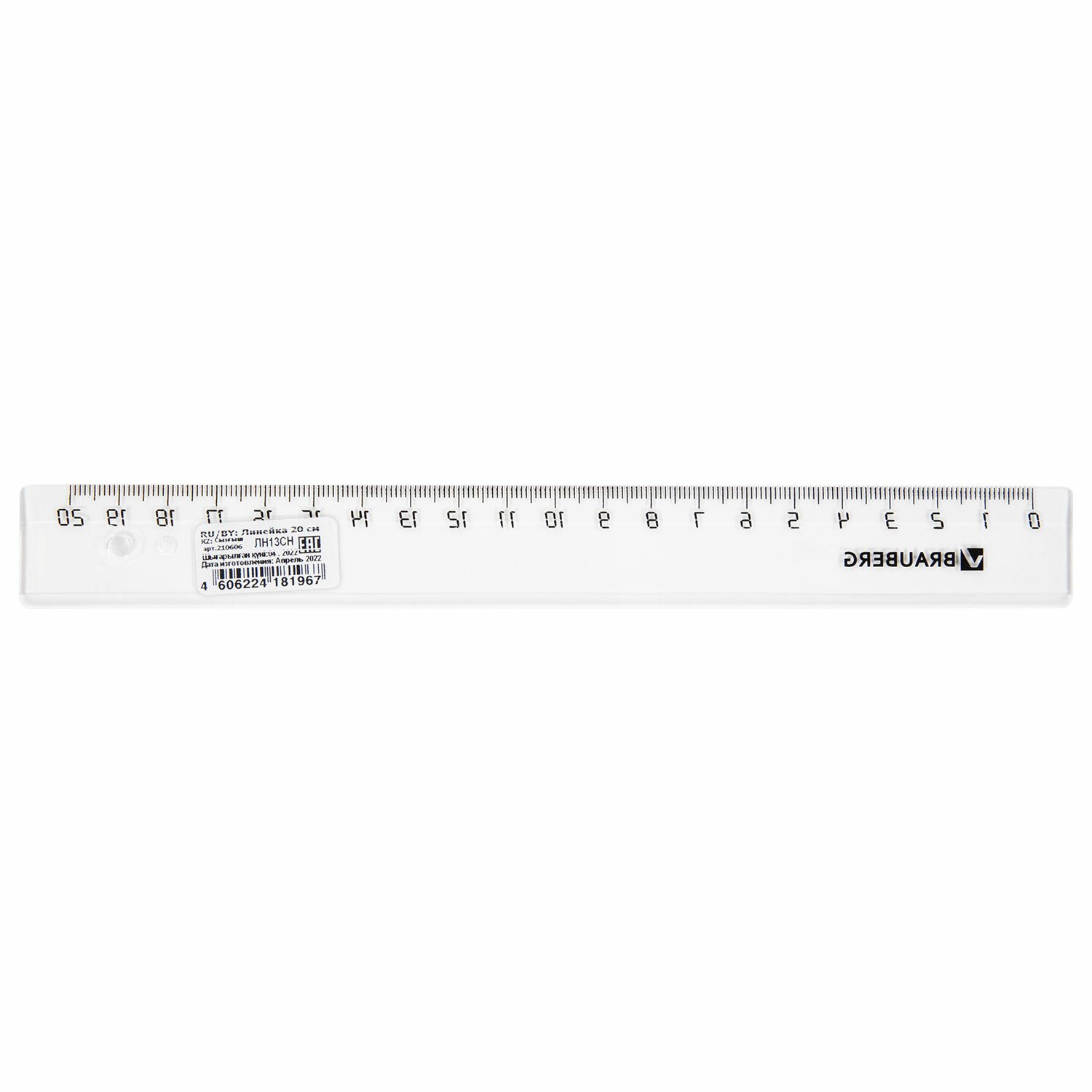Линейка пластиковая 20 см, BRAUBERG, прозрачная, тонированная, 210606