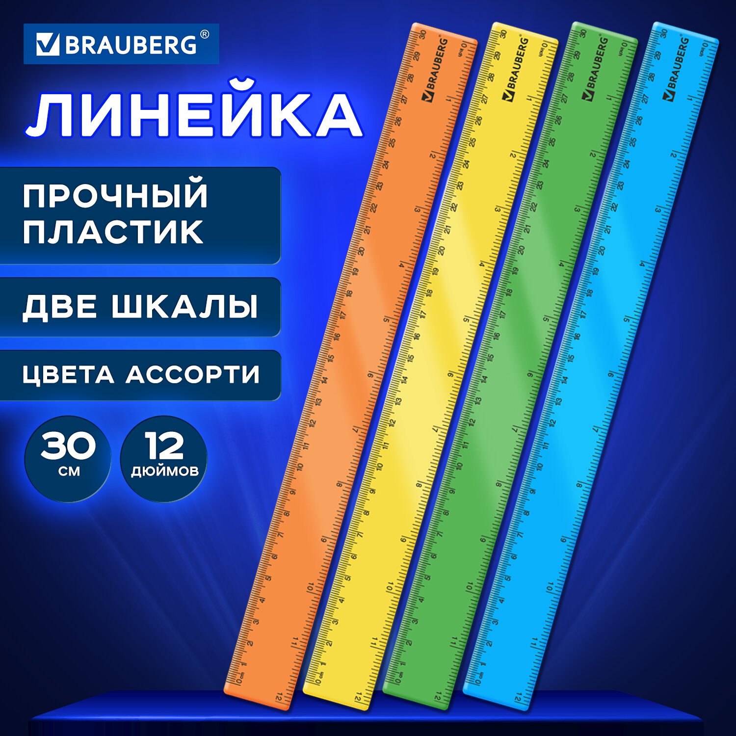 Линейка пластиковая 30 см, BRAUBERG, непрозрачная, неоновая, ассорти, 210839