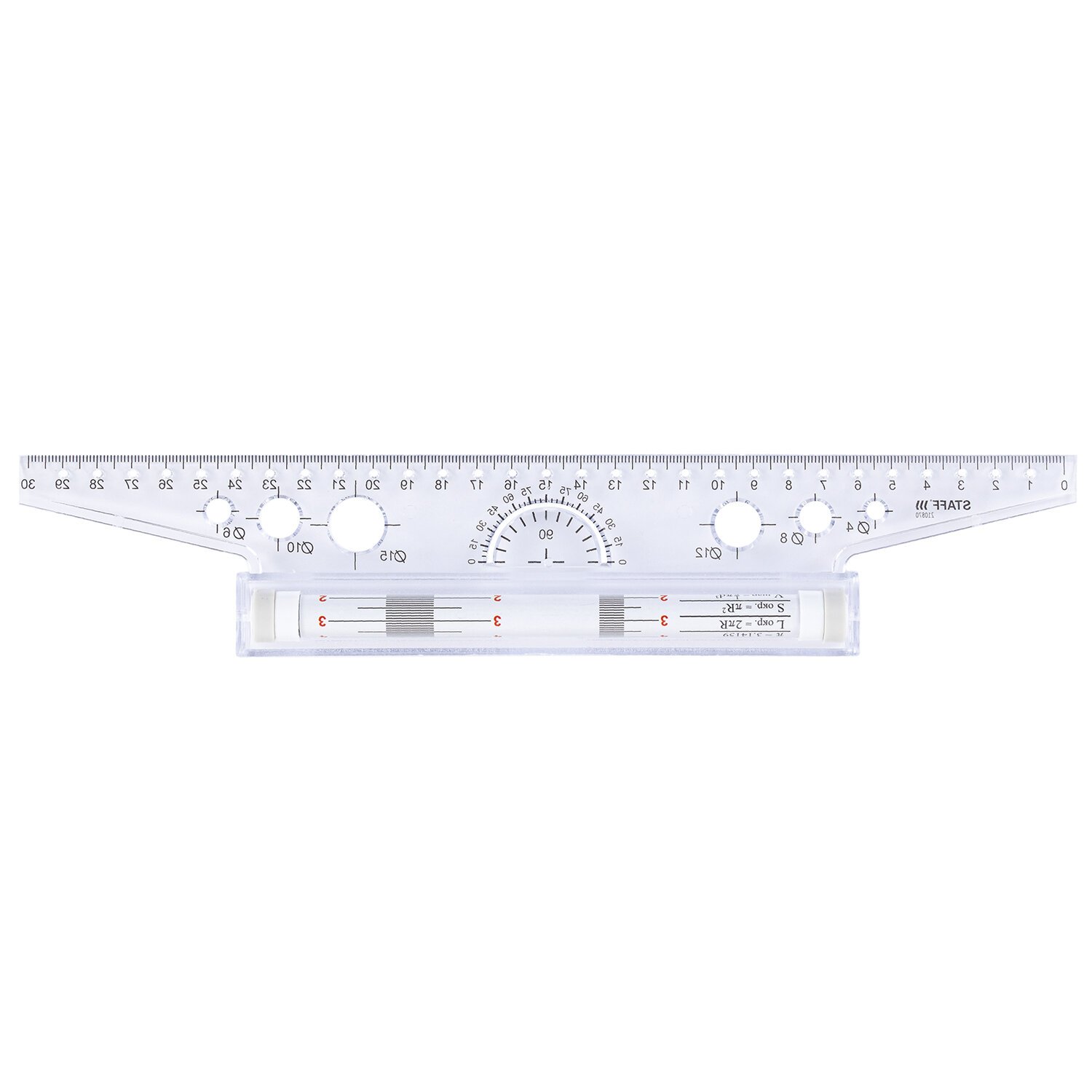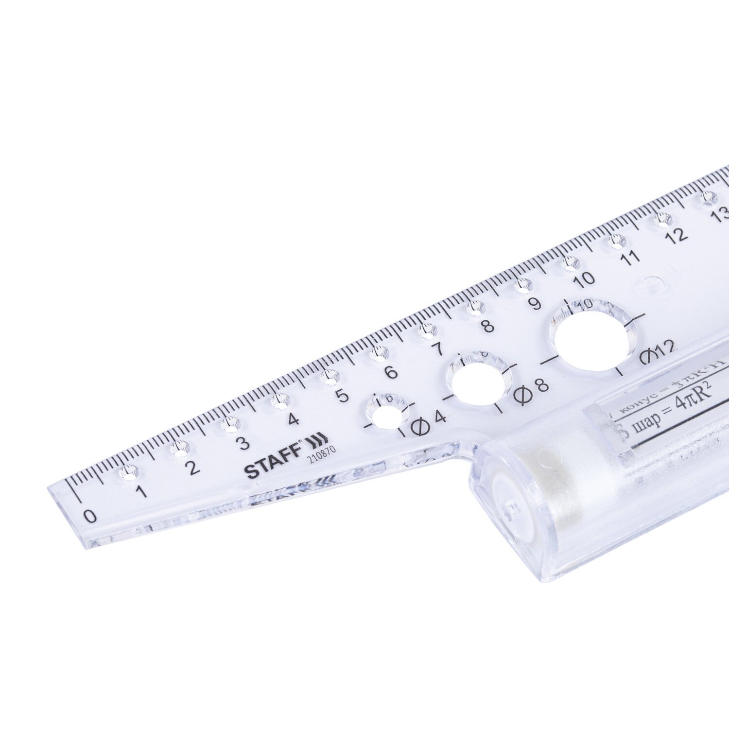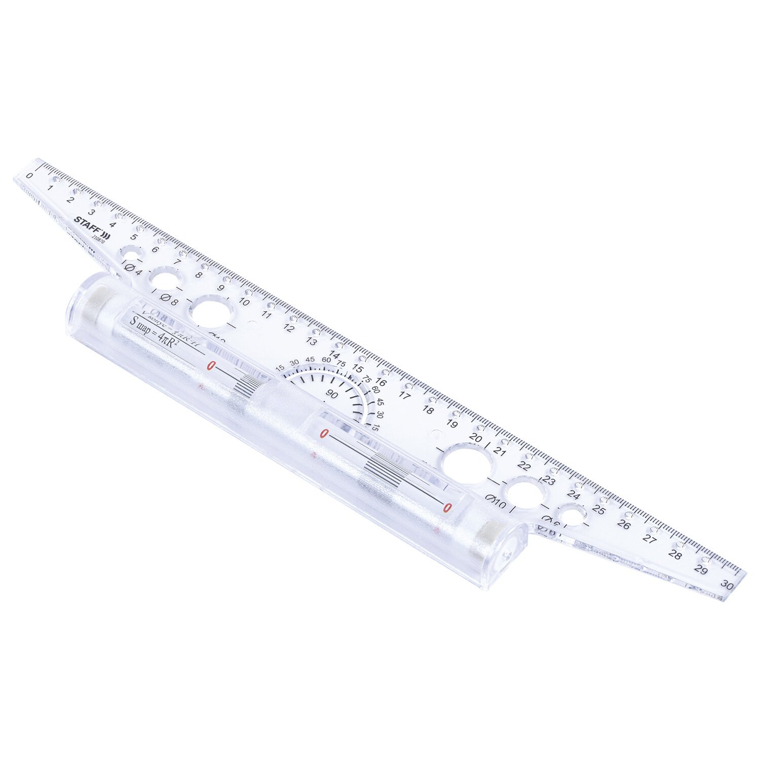 Изготовлена из высокопрочного пластика. Оснащена металлическим антискользящим роликом, на котором изображена измерительная шкала и геометрические формулы. Длина шкалы составляет 30 см. На линейку нанесена измерительная шкала и шкала транспортира. Также снабжена трафаретом окружностей различных диаметров. На ролике