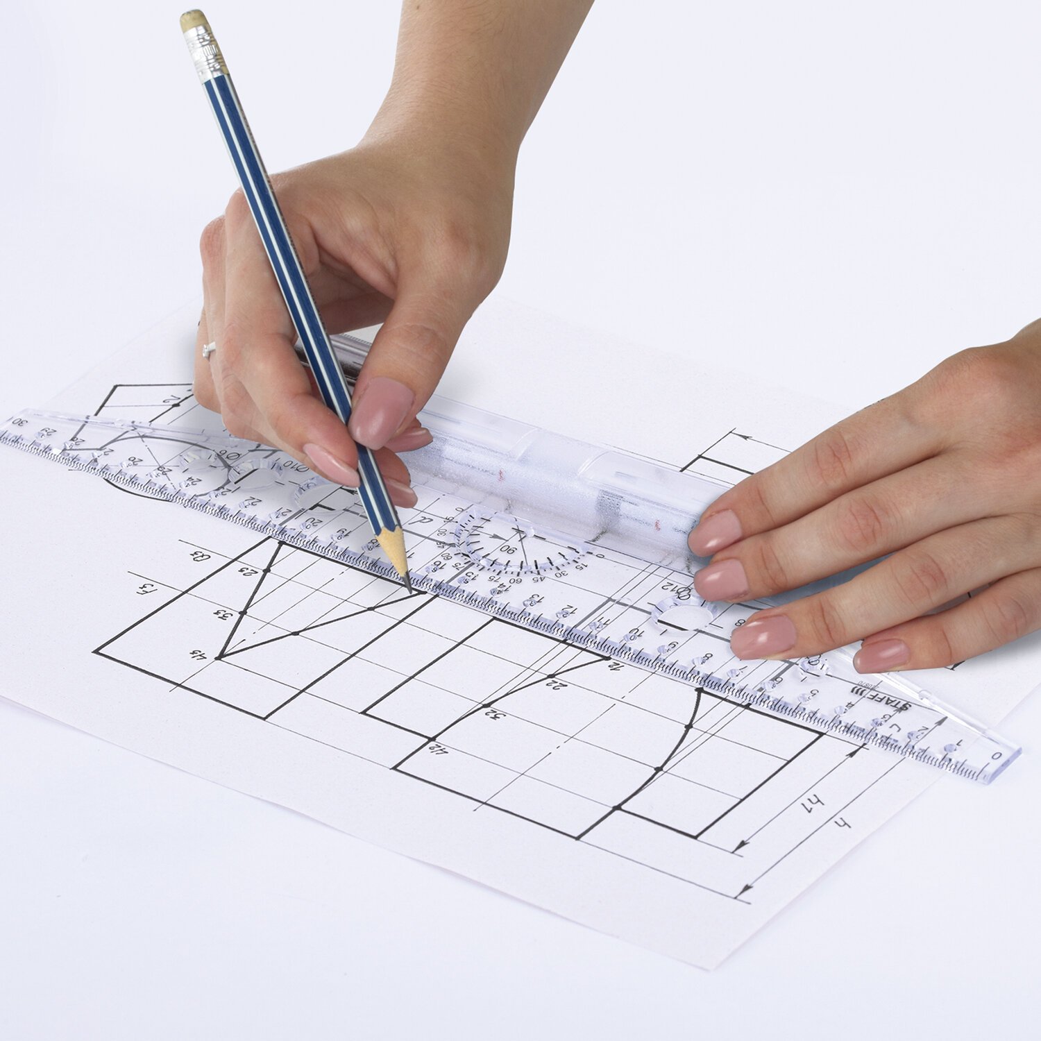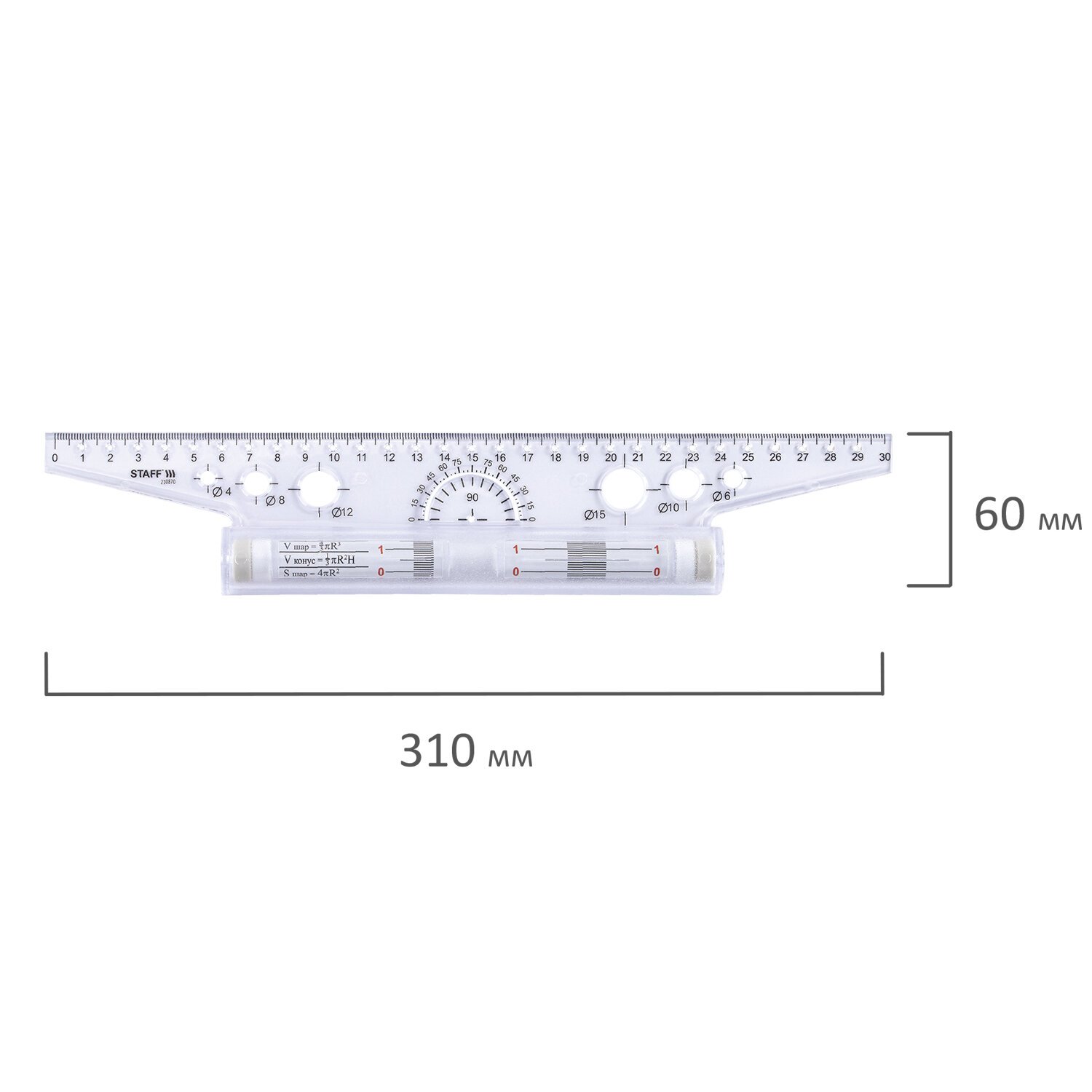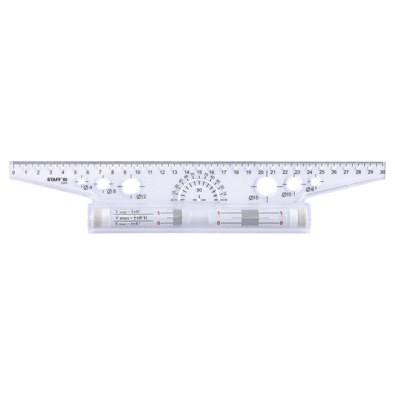 Изготовлена из высокопрочного пластика. Оснащена металлическим антискользящим роликом, на котором изображена измерительная шкала и геометрические формулы. Длина шкалы составляет 30 см. На линейку нанесена измерительная шкала и шкала транспортира. Также снабжена трафаретом окружностей различных диаметров. На ролике