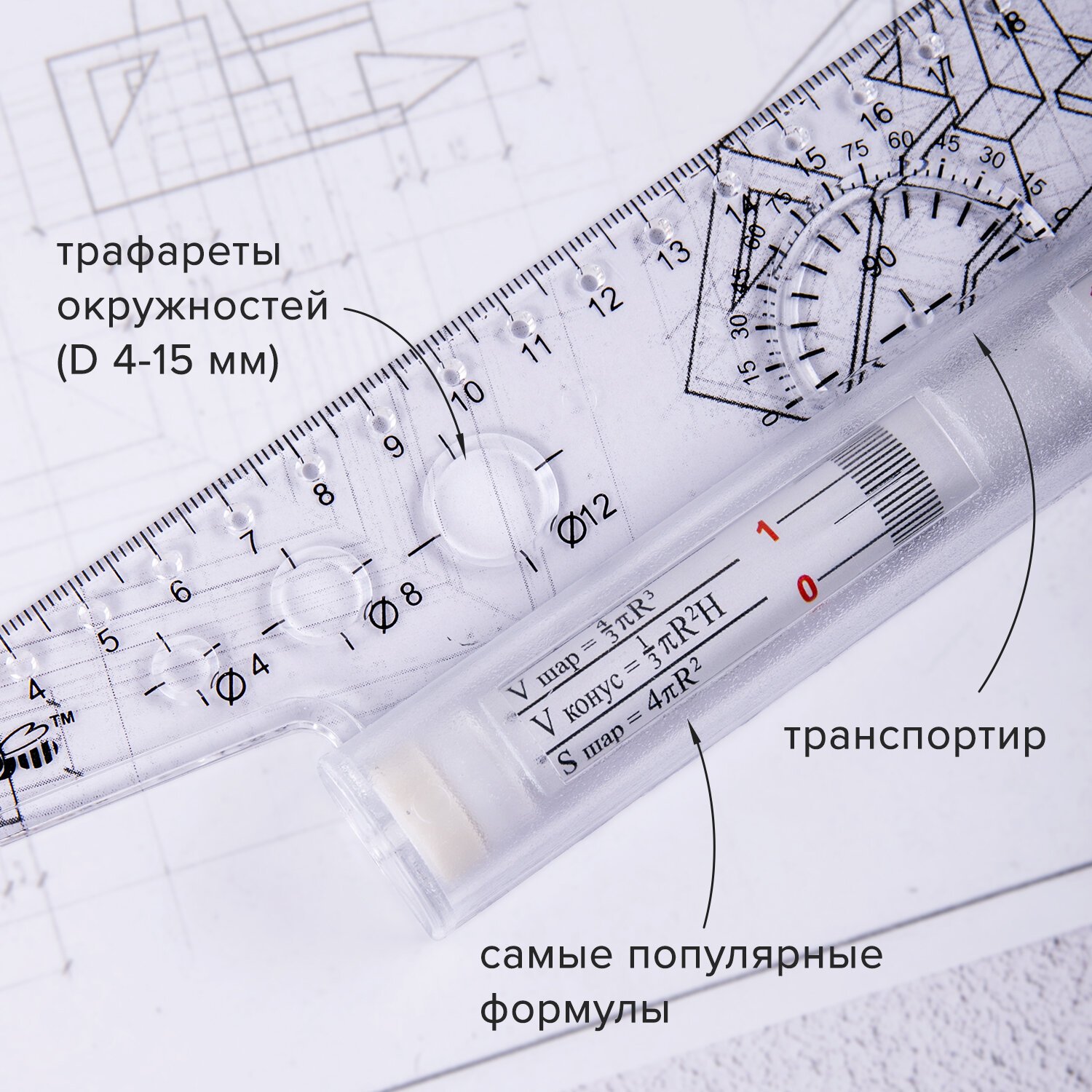 Профессиональный чертежный инструмент в виде линейки с металлическим роликом. Включает в себя транспортир, и отверстия. Позволяет проводить параллельные линии на определенном расстоянии друг от друга. На ролике нанесены часто используемые формулы.