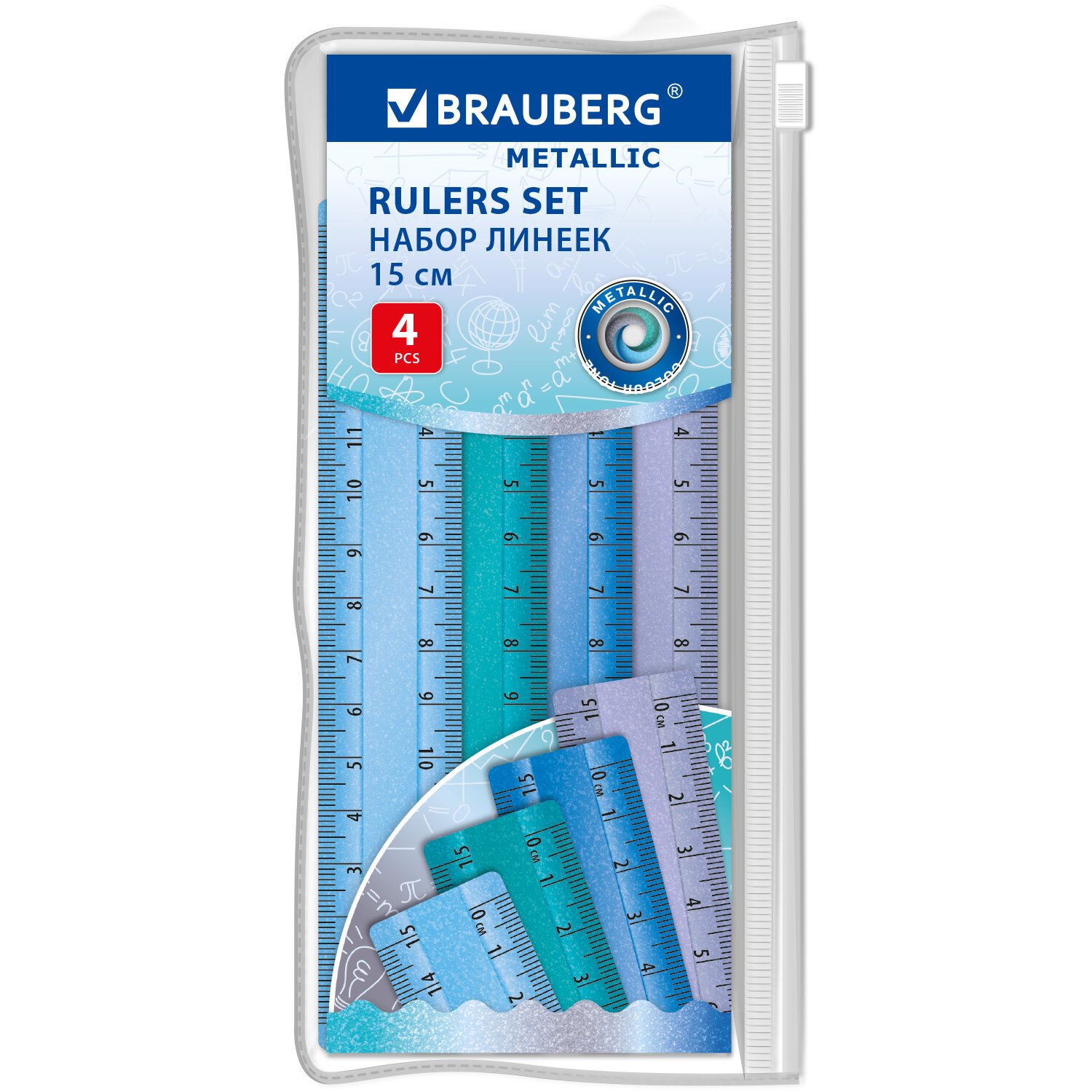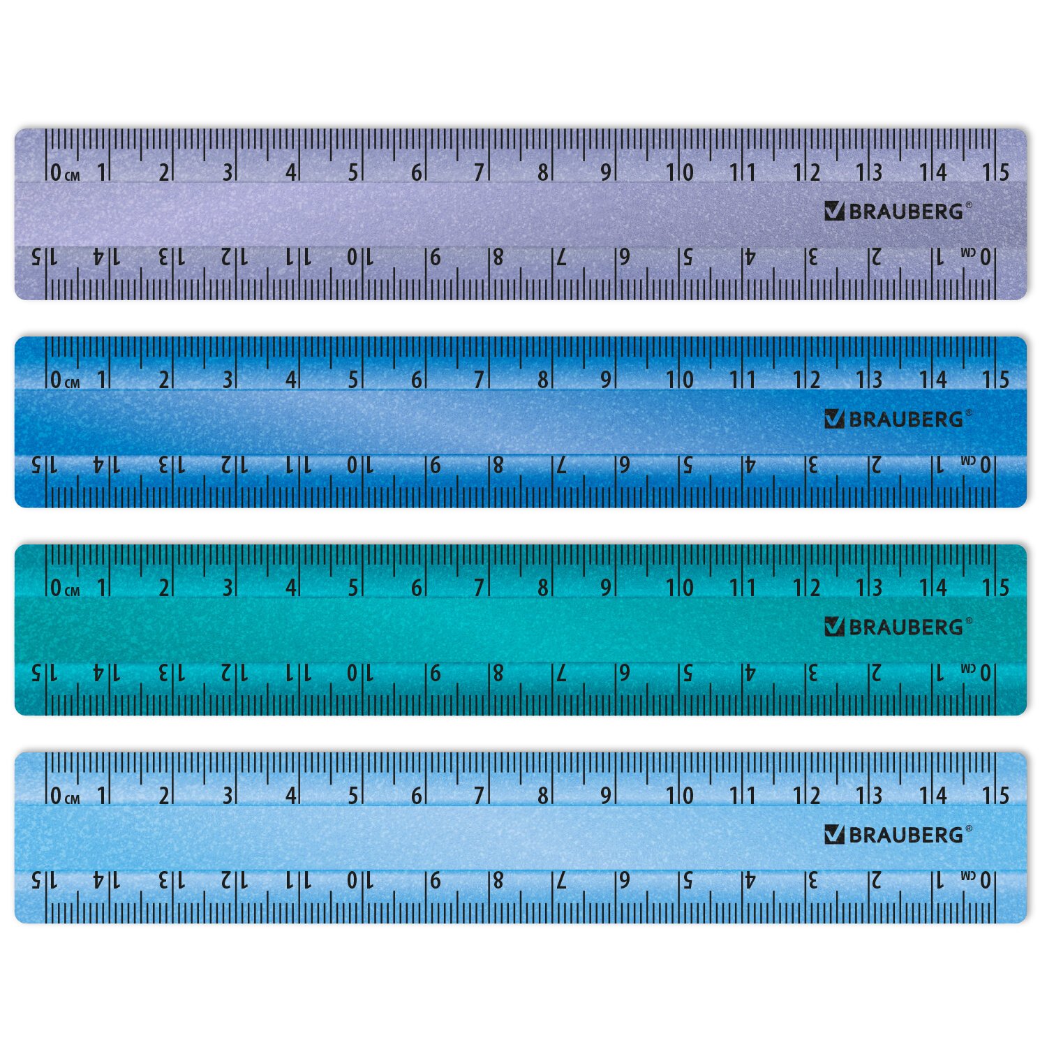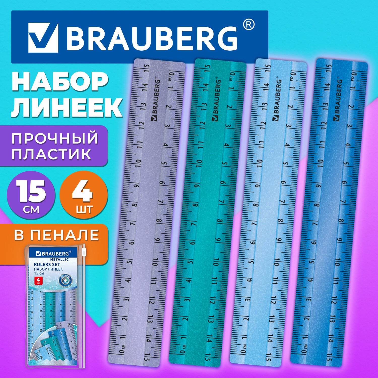 Линейки пластиковые 15 см металлик BRAUBERG, НАБОР 4 штуки, непрозрачные, пенал, 210882