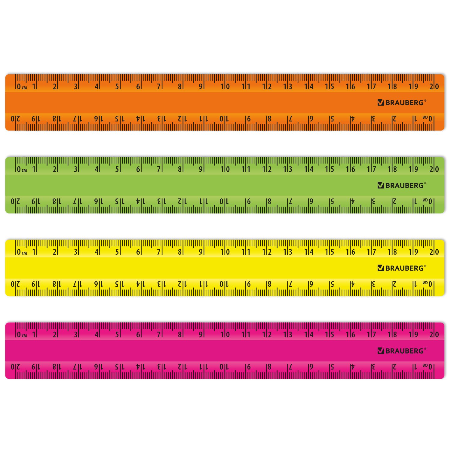 Линейки пластиковые 20 см неоновые BRAUBERG, НАБОР 4 штуки, непрозрачные, пенал, 210904